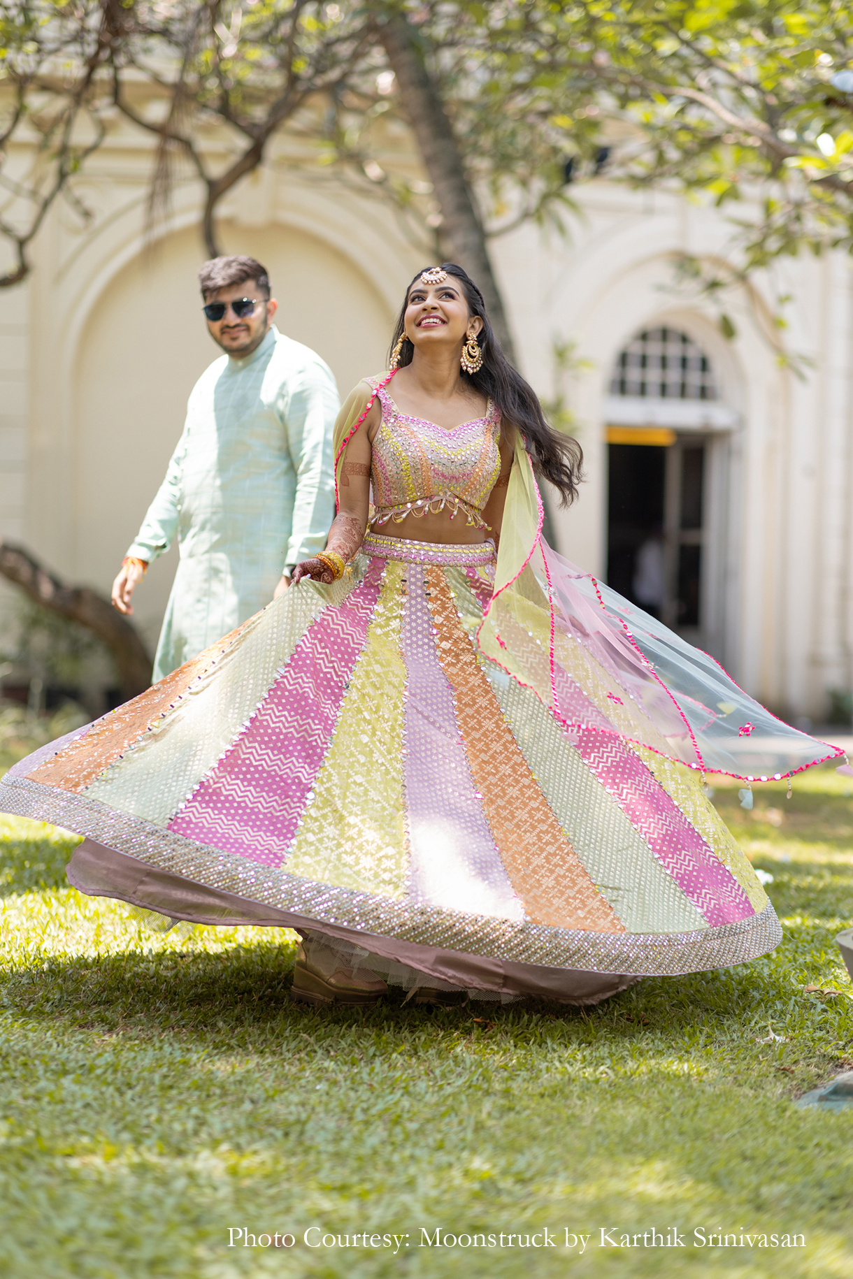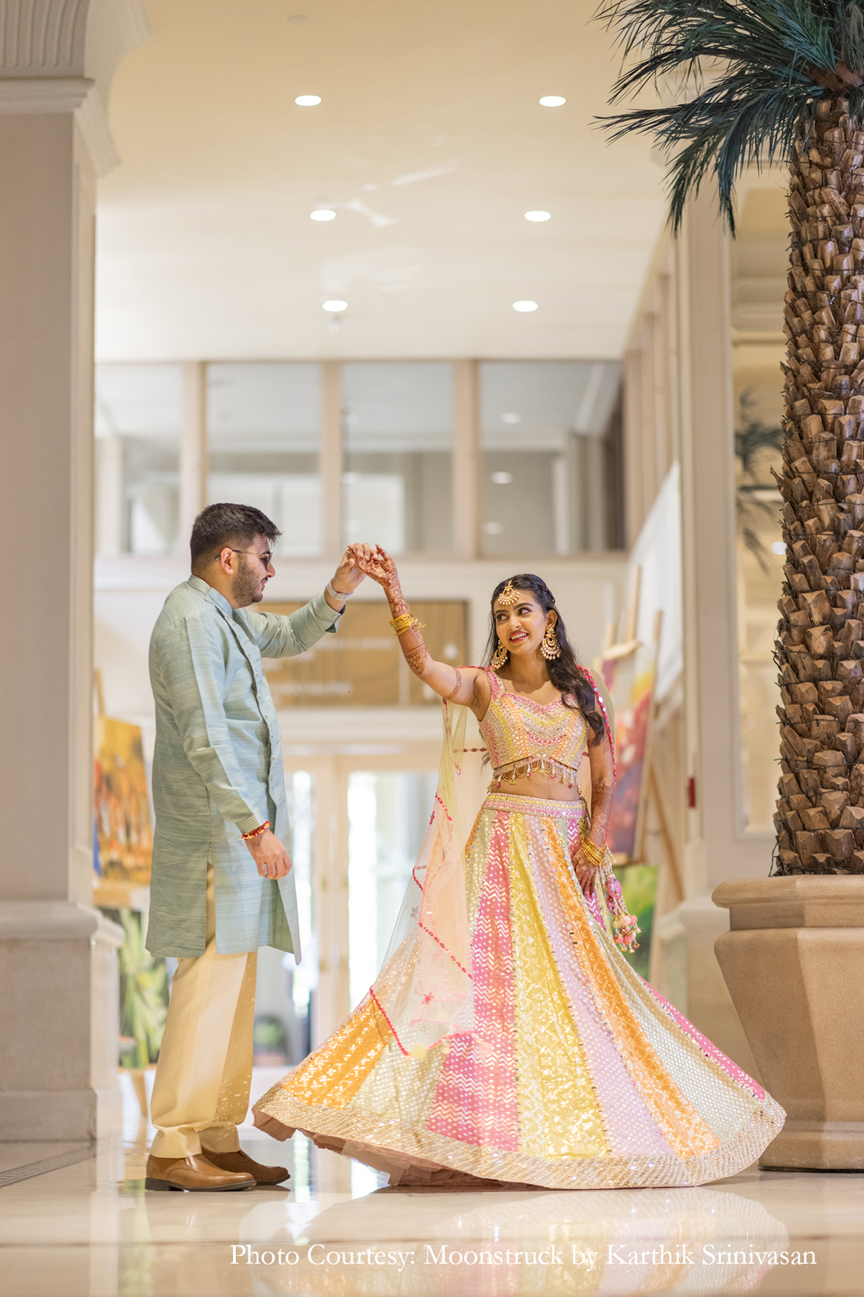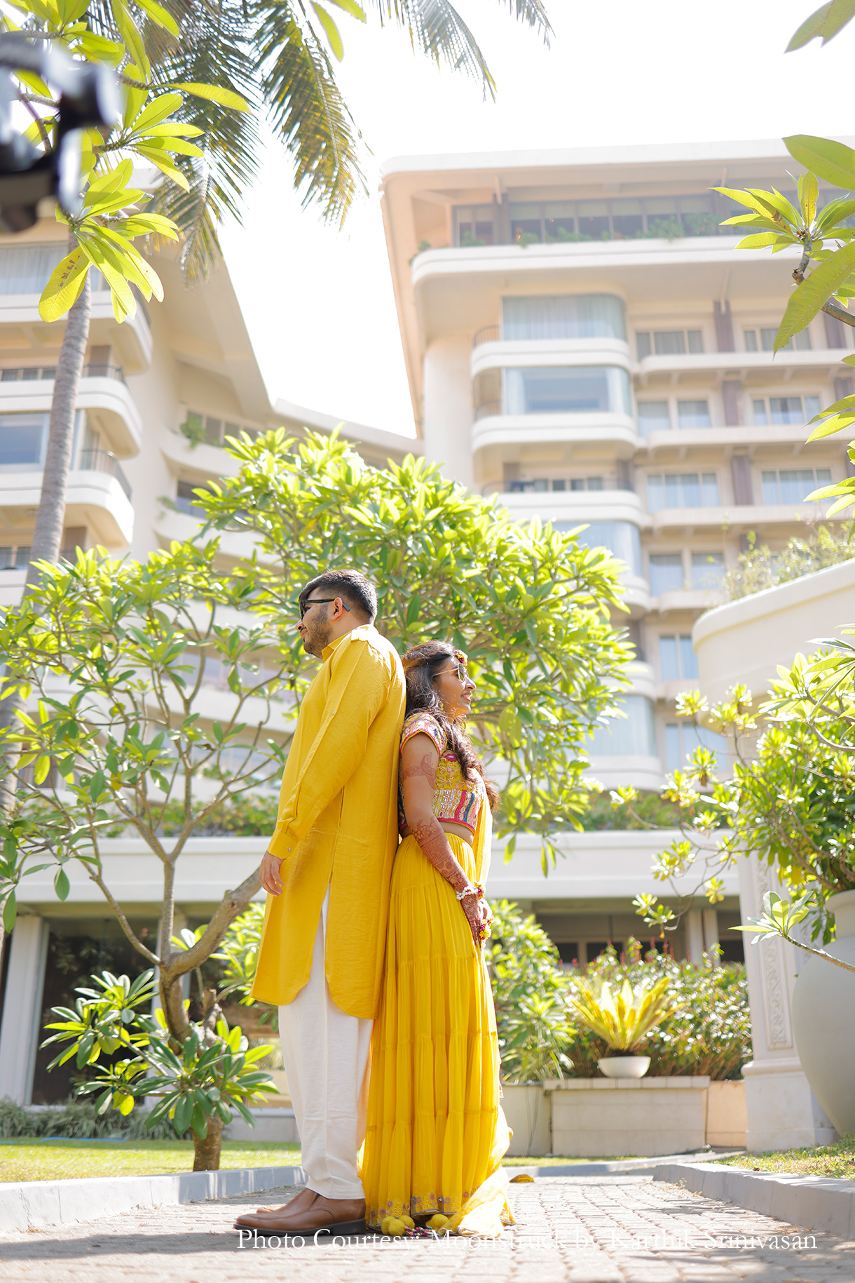 The couple says, “Our wedding festivities kicked off with a vibrant and colourful welcome lunch and mehndi ceremony. The ballroom, with its breathtaking view of the Indian Ocean, was transformed into a joyful celebration of bright pinks, yellows, and sunshine vibes. Every corner radiated cheerfulness, from the décor to the vibrant attire worn by everyone. The atmosphere was filled with laughter, music, and the intricate art of mehendi. It felt like the perfect, heartwarming start to what would be an unforgettable journey of celebrations.”
