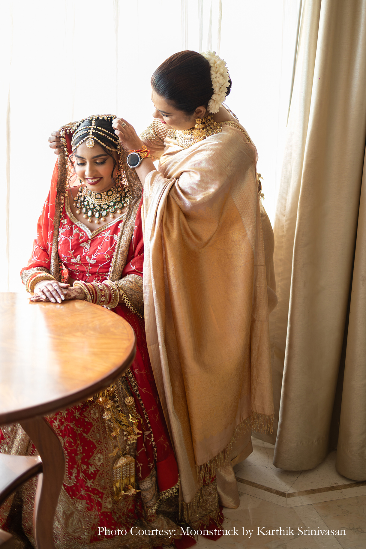 “The evening of Day 1 brought with it an electrifying Sangeet, with a theme of ‘Glitz and Glam’. The Grand Ballroom shimmered under purple and red lighting, creating an elegant yet lively atmosphere. Friends and family took the stage, performing some unforgettable dance routines. But the highlight was our couple dance which was full of dips, lifts, and moments that brought the room to life with applause and love. The energy was unmatched, and we danced the night away, knowing we’d remember this night forever,” shared the happy newlyweds.
