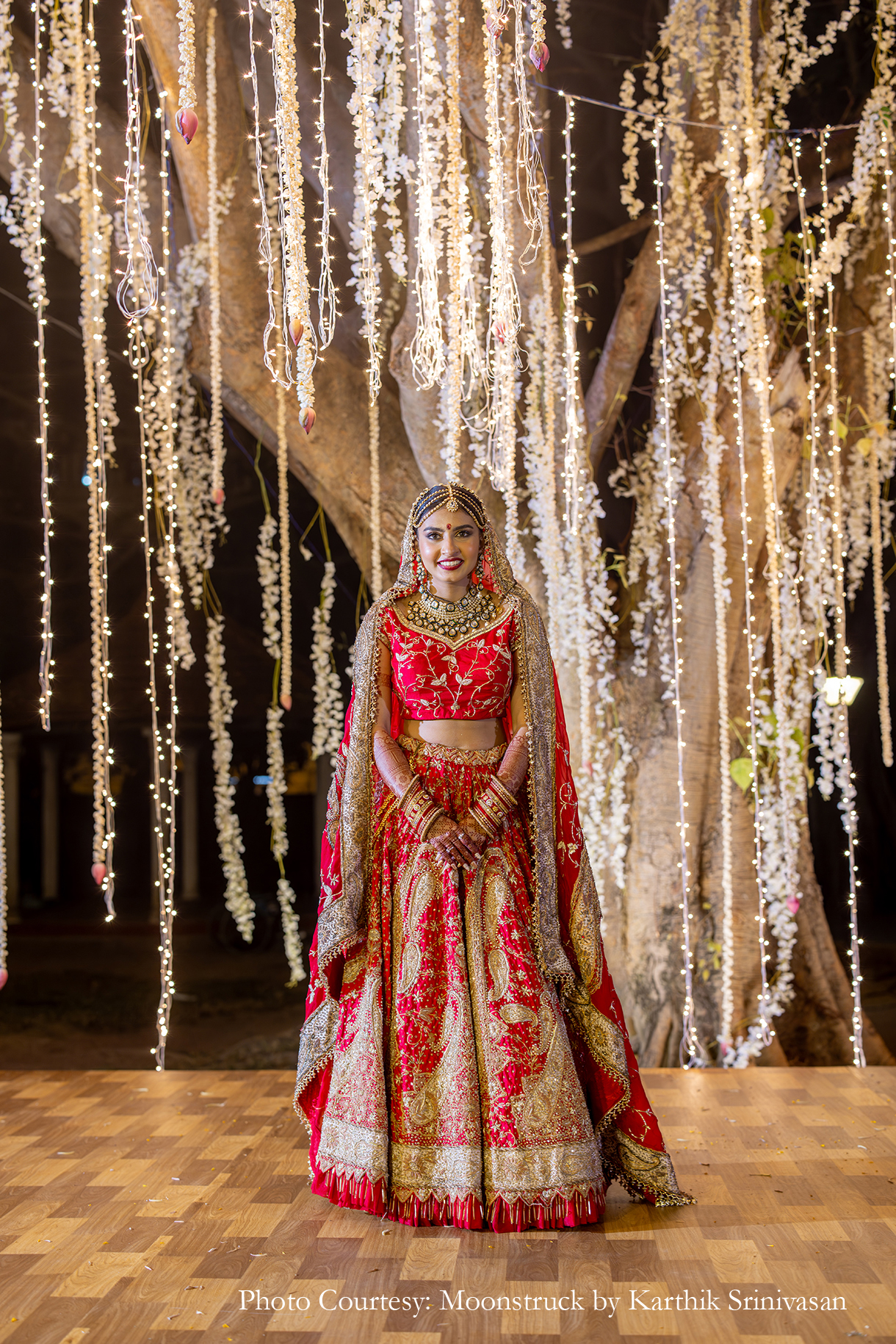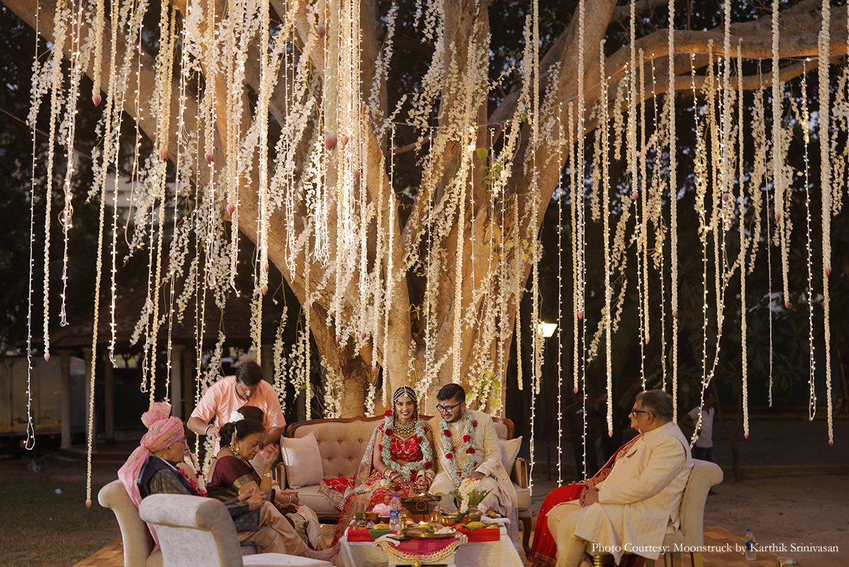 Varun shares, “The wedding day was nothing short of magical. The baraat kicked off at 4 PM, a high-energy procession with an amazing DJ, five dhol players flown in from Chennai, and a vintage car that took us around the property, making it feel like something out of a dream. The grand highlight of the wedding was the mandap— set under an enormous banyan tree, draped with LED lights and fresh flowers, it was transformed into an ethereal setting. Aakriti’s entry was incredibly special— she had pre-recorded a message, and as she walked down the aisle, she sang a song, adding a personal touch that left everyone in awe. As we exchanged our varmalas during sunset, the entire scene felt surreal, with the colors of the sky blending into the twinkling lights of the banyan tree.”