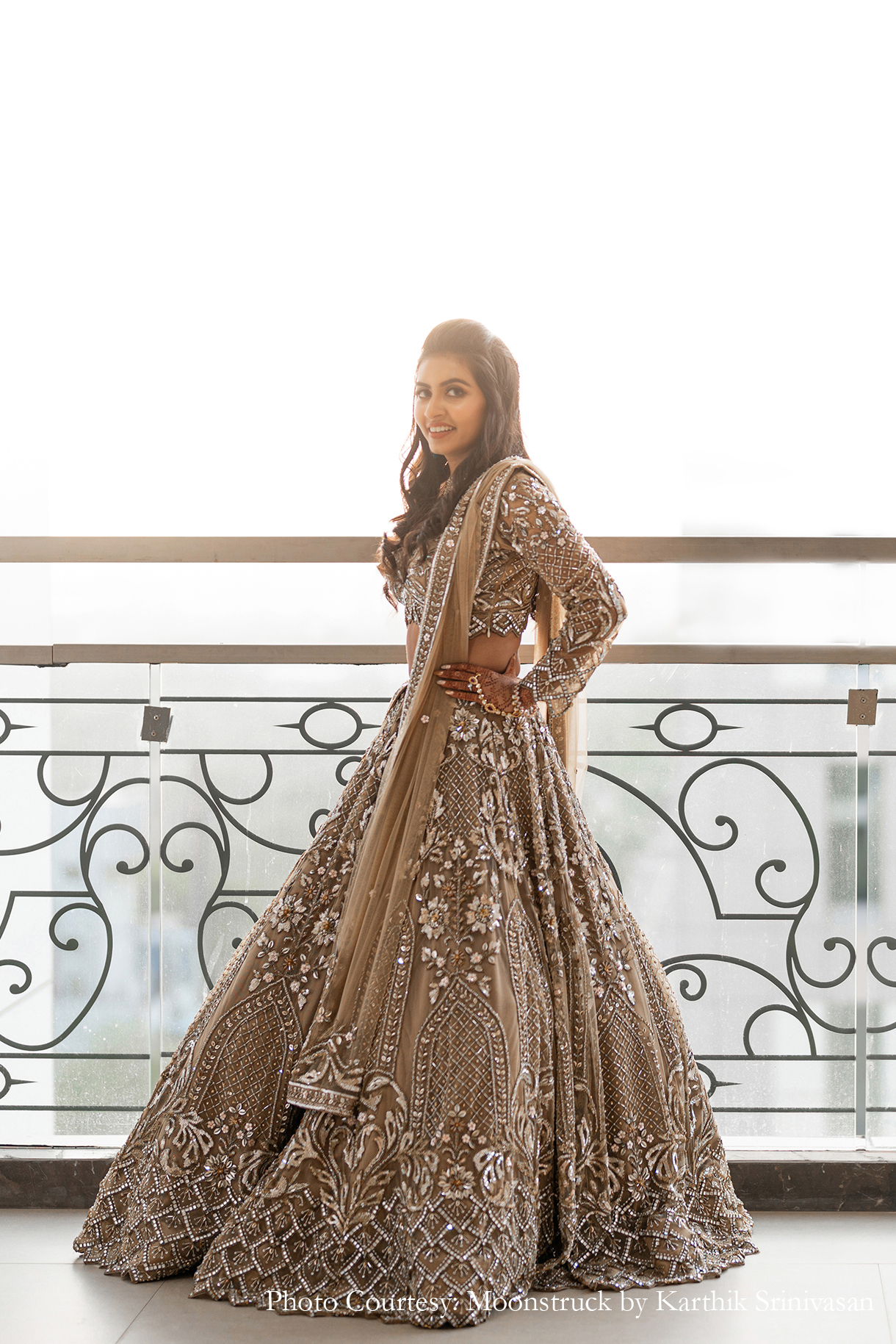After landing in India post their wedding celebrations in Sri Lanka, the couple hosted a glitzy reception in Chennai. Donning a gold lehenga, Aakriti looked stunning as she paired up with Varun, in a dapper black suit, for some stunning reception shots.