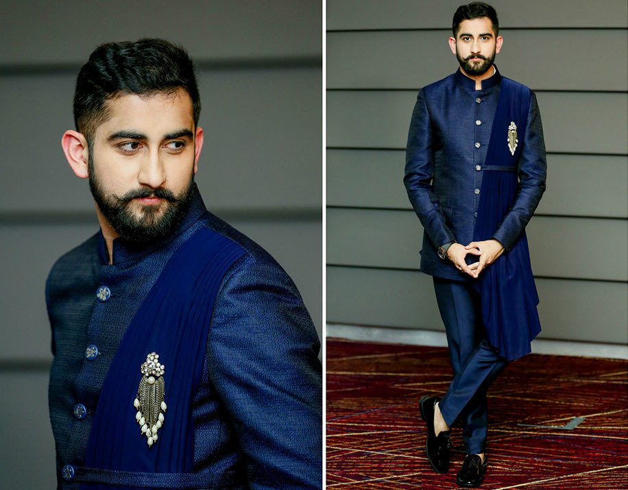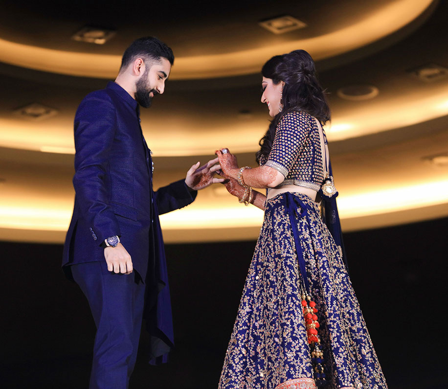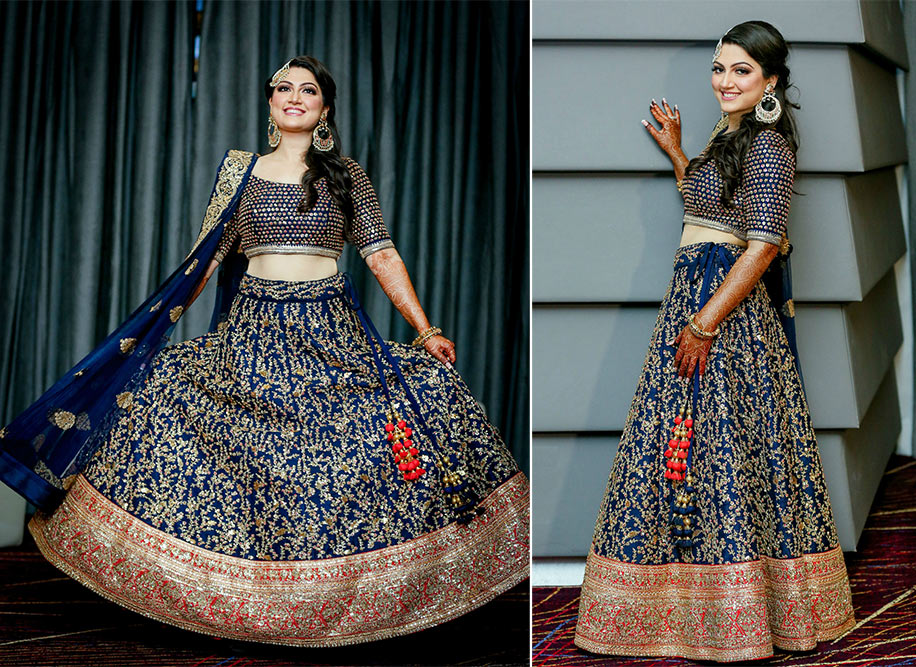 My embellished sangeet lehenga complemented Akshay’s midnight blue outfit with a lot of gold embroidery! I think we looked great!”