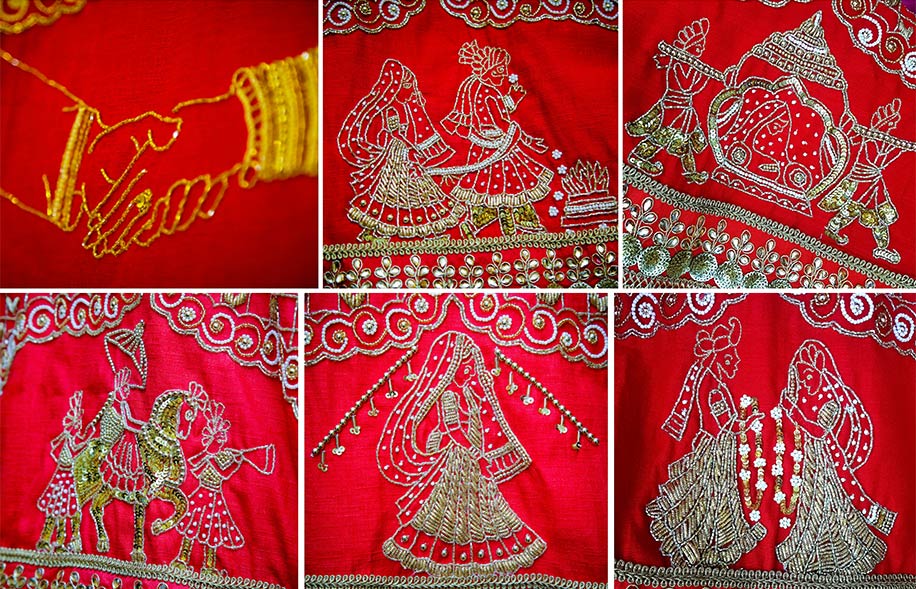 Akshay had always said he wanted me to dress in traditional red at our wedding and so I decided to make this lehenga very ‘me’. I had Hindu wedding rituals lke the var mala, bidaai, baraat embroidered into the border of my lehenga. It was a risk – I thought it would be a total disaster or extraordinary. After all the sleepless nights, it turned out just the way I had imagined it.