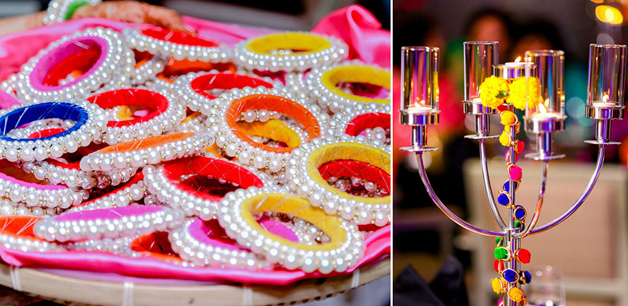 Our Mehndi decor was just entirely marigolds which I have to say, left me and our guests stunned. We had beaded colorful bangles for the ladies and made special parrot-shaped brooches for the men as party favors. There was a really cute photo booth corner for the guests.