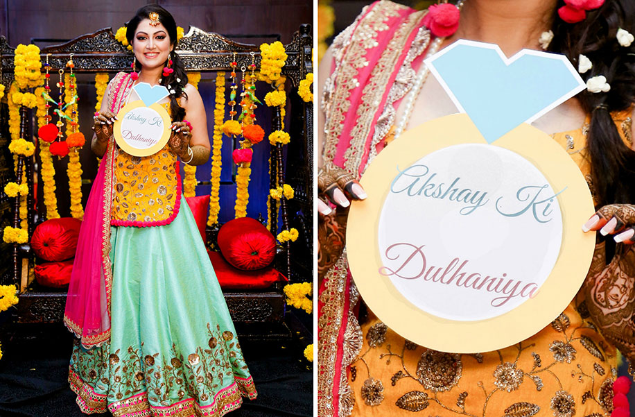 I’d designed my entire trousseau and wanted my mehndi lehenga to be colorful and quirky. I incorporated pompoms on the hems and tassels to match the floral, gold and pearl mix and match mehndi jewellery.”