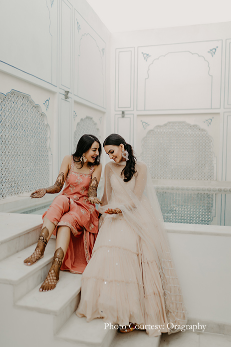 Following an ‘Emerald’ theme, Aanchal’s mehndi was a fun-filled affair where the bride had plenty of fun dancing to her favorite tracks surrounded by her girl squad. Held under a sheer green canopy that played peek-a-boo with the desert sun, everyone was showered with marigold petals as they reveled in the music. For her own bridal mehndi, Aanchal donned a contemporary peach salwar suit, while for her mehndi celebration, she chose an off-white mirror work lehenga. Her groom complemented her in a floral off-white bandhgala.