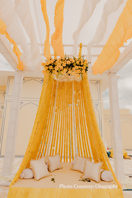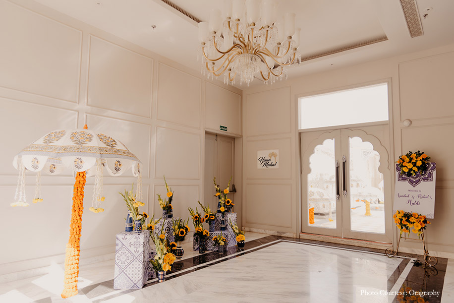 With a ‘Sapphire’ theme that reflected in the dress code of the guests, the Haldi ceremony went easy on the decor with marigold garlands and white canopies peppered with orange. Held under the bright blue sky dotted with wispy clouds, this ceremony had its moments of laughter and tears as everyone happily smeared the bride with turmeric.