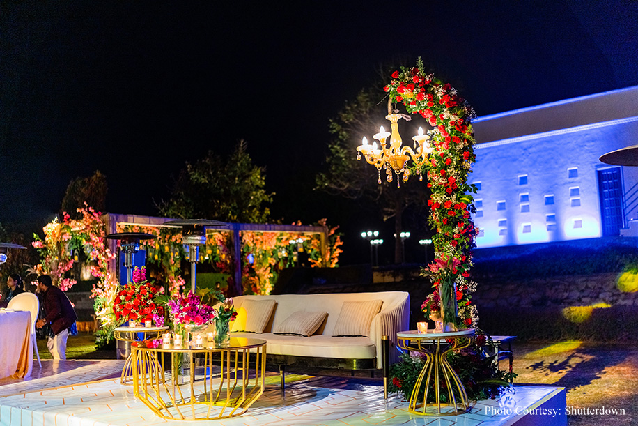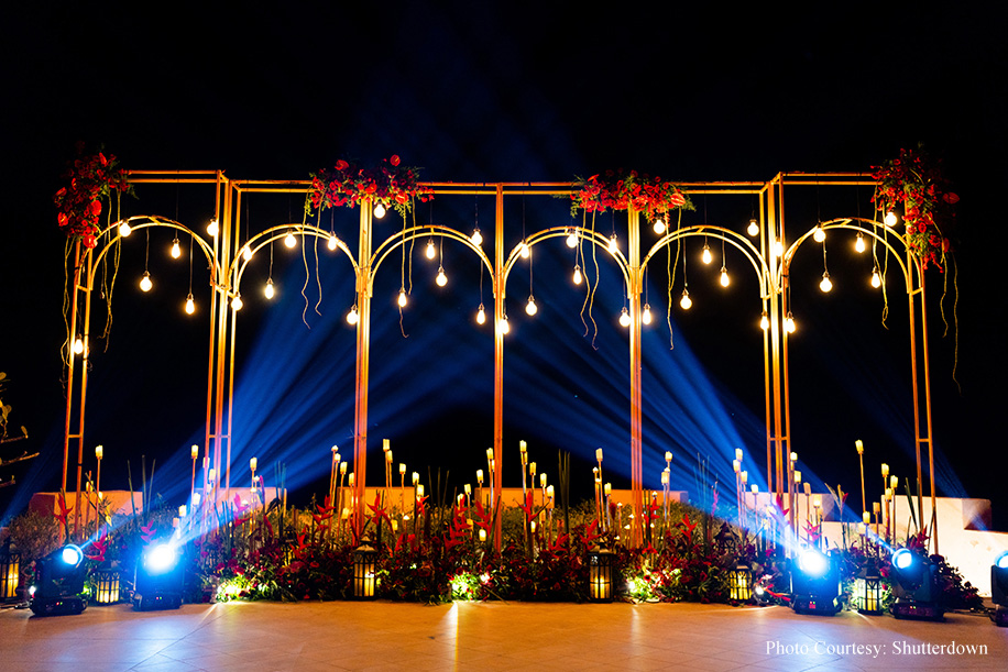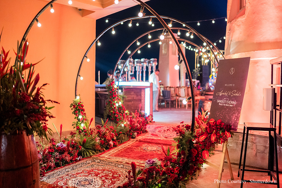 Unlike the usual sangeet celebration where one sees a spike in the glamor quotient, the couple opted for a cozy setting which ensured everyone was comfortable as they took to the stage. An entryway with vintage bulbs welcomed the guests while a stage backed by LED candles dominated the rooftop venue.