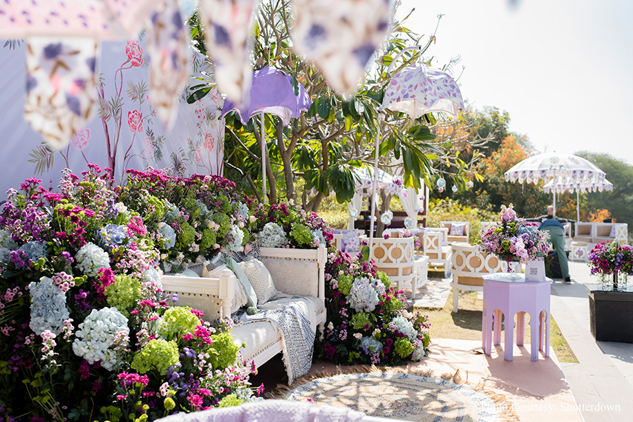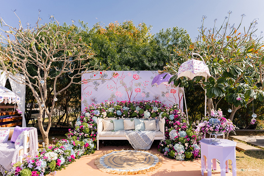 A pastel celebration swathed in hues of blue and lavender with delicate blooms like hydrangeas, peonies and roses. The furniture matched the decor theme too with its ivory upholstery and a lavender coffee table.