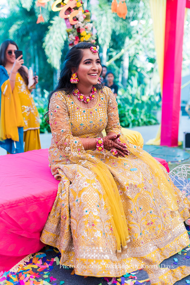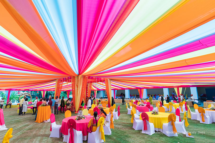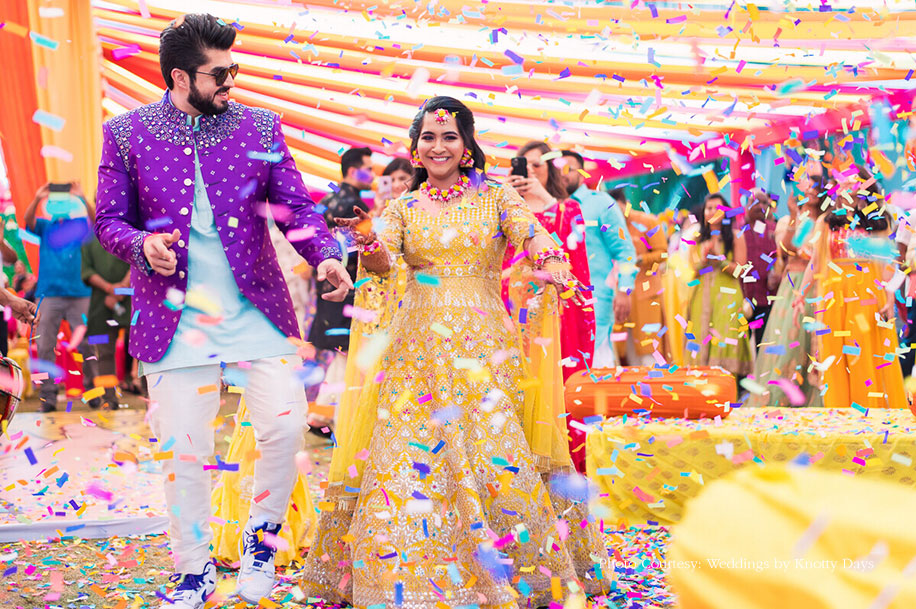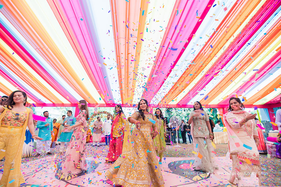 Vibrant hues of orange and pink ruled the Mehndi celebrations, with flowing drapes, flowers and balloons adding a dose of youthful freshness to the ambience. Quirky props, signs, games and performances added to the fun of the event as the guests enjoyed delectable food and drinks. A charming bangle bar was one of the highlights of the day, while a memorable shoe game of the bride and groom had everyone in splits. The bride wore an embroidered mustard gown and dupatta by Roop Saree, with yellow and pink floral jewelry, while the groom stunned in a bold purple Jodhpuri jacket.