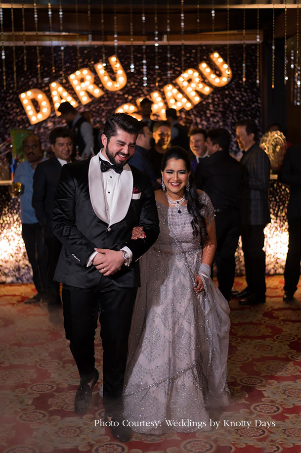 The glam Sangeet night held in the grand ballroom saw a host of dazzling performances by the couple and their loved ones. The inviting, sparkling bar area was lit up with an eclectic neon ‘Daru Sharu’ sign. The groom looked dapper in a silver and black tuxedo while the bride glistened in an embellished silver lehenga.
