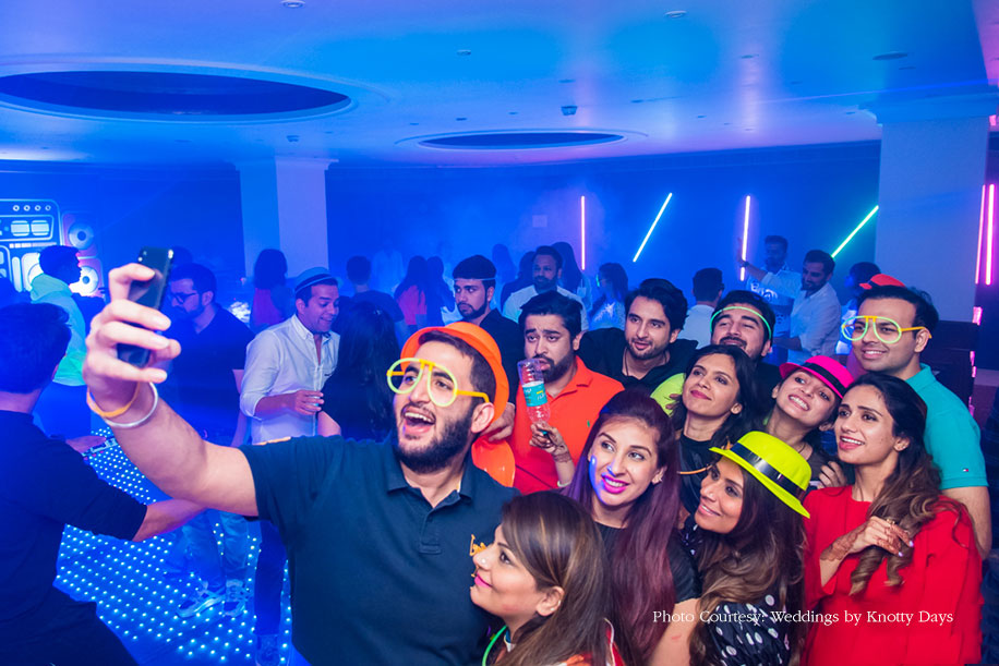 The couple along with their friends and cousins hit the dance floor back at Taj Krishna for a rocking after-party. Dressed in relaxed athleisure wear, everyone grooved to the DJ’s beats amidst psychedelic lighting till the wee hours of the morning.