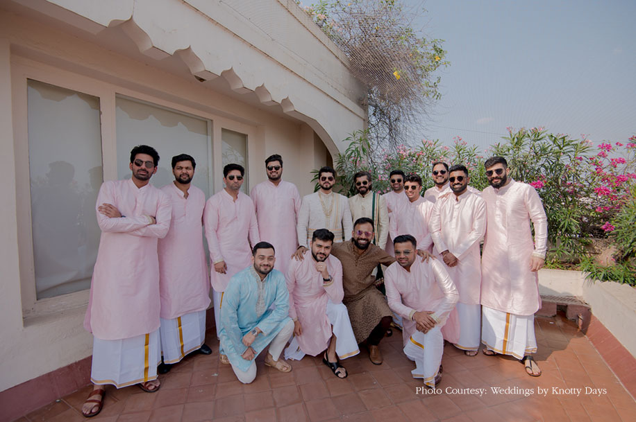 The nuptials were a breathtaking mix of Tamil and Sindhi cultures, with both families coming together in a harmonious blend of traditions. Aarti embodied the quintessential Tamilian bride in a rich coral Kanjeevaram saree with traditional temple jewelry, while Kunal was every bit the ‘Sindhi Dulha’ in a stunning blush sherwani, layered dupattas and a turban embellished with a feathered Kalgi.