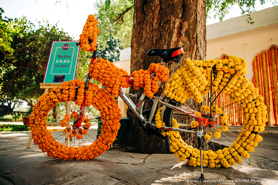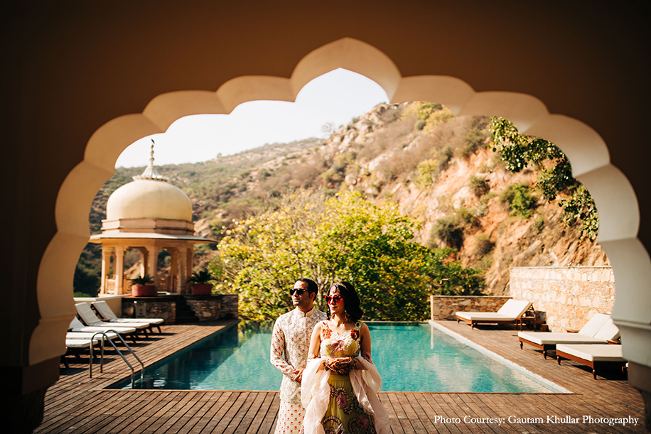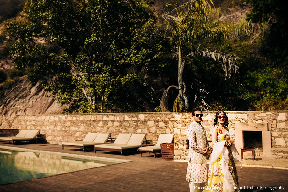 The bride-to-be shares, “We wanted our functions to flow elegantly by maximizing Samode’s natural beauty, so lots of flowers and fairy lights were incorporated for an added traditional charm. The girls at Baraati Inc beautifully worked on the concept and executed the wedding in the way we had envisioned. The team at Gautam Khullar Photography worked wonders with their photography skills. Gautam made sure he captured our portraits with the beautiful surroundings of Samode.”