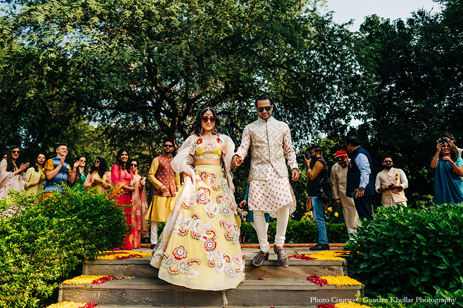 The Rajasthani Bazaar themed mehndi with varied elements like tote bags counter, fun camel rides, kite flying sessions, bangles, pocket squares and mirror counters were a delight for the guests to indulge in for fun activities and favors. Bright marigolds and soothing sea-green decor brought the beautiful venue to life with its minimalistic charm. The soon-to-be-weds, along with the baraatis, put their best fashion foot forward in vibrant clothes. Aarushi made a style statement in a lemon lehenga by Aisha Rao while the dashing groom walked in with a printed white and red kurta and bandhgala set by Arjun Duggal.