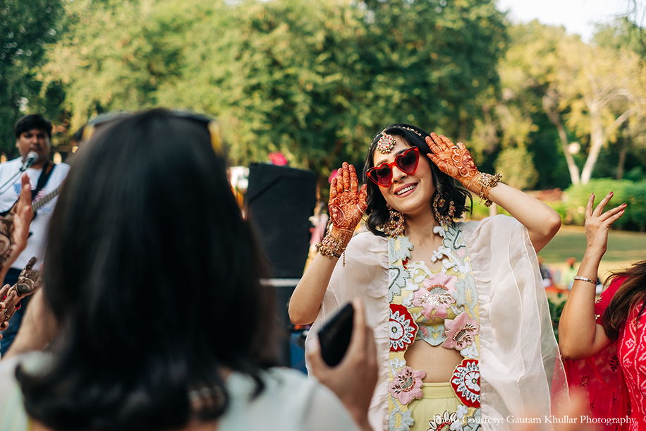 The wedding celebrations kickstarted with an intimate bridal mehndi tea party held at Samode Palace’s courtyard. Following the Bride’s love for ‘Chai and Parle G’ which was the central theme, the venue was decked up with fairy lights, bright marigolds and hand-painted kettles, specially curated from the local artisans. Aarushi was glowing under the sun wearing a green embellished jumpsuit with a tie and dye puffer short jacket by Papa Don’t Preach by Shubhika.