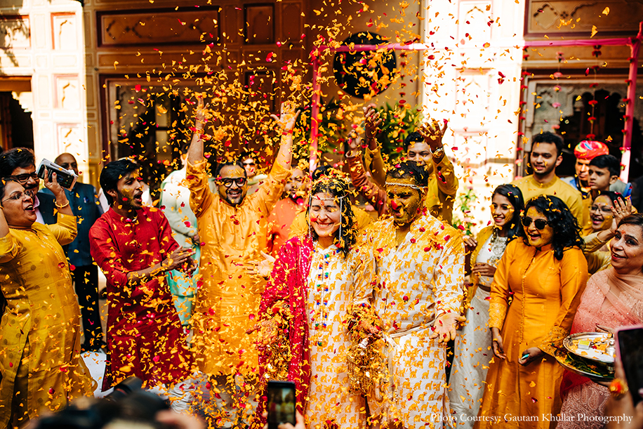 From smearing the bride with turmeric paste and covering her hands with chooras to showering her with yellow petals, everything about the Haldi function was magical. Aarushi looked pretty in a camel printed white and yellow kurta that she paired with a fuchsia dupatta.