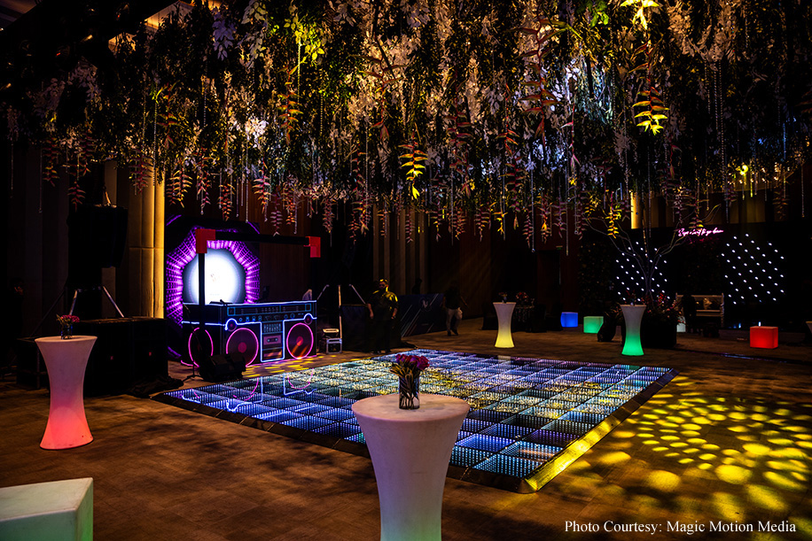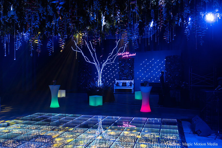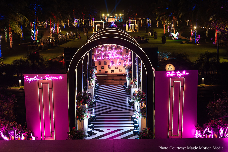 Siddharth shares, “The evening buzzed with a neon-themed Sangeet. Guests strolled through a tunnel of pop colors, getting a peek into the couple’s love story. Photos lined the walls, and cute neon signs marked special words and places, weaving the tale that started in high school. A live band had everyone grooving to retro and contemporary hits, ending the night on a high note.”