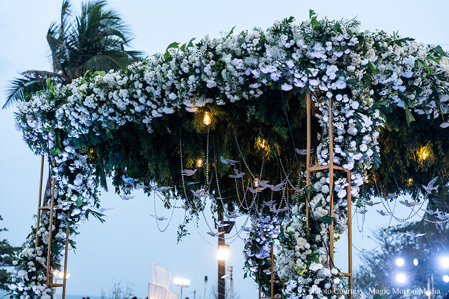 This couple’s beachside mandap was whimsical yet elegant with floral installations, crystal birds and acrylic beads.