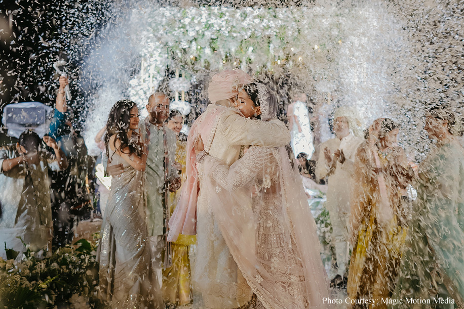 All-white decor with crystal birds and glass lanterns twinkled at twilight, creating a dreamy mandap on the sandy beach. The white and crystal decor sparkled against the sea and sand, perfect for Aashika and Udhav’s Hindu wedding, complete with a ‘Two States’ theme. Going for a chic and beachy vibe, the couple opted for an acrylic mandap decked out in white and green, seamlessly blending with the natural surroundings. Large white floral installations, a glass walkway for the couple and their pet dogs, and floating flower petals added to the ethereal feel. The solemn ceremony paved the way to the finale, where a live band had everyone on their feet with Bollywood hits and setting the dance floor ablaze.