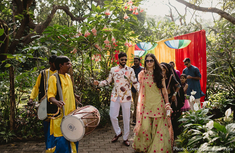 “Our mehndi was a daytime affair. The event was vibrant with bright colors and ethnic touches. Bright drapes were used at the entry along with colorful umbrellas and golden elephant statues. Pallav and I entered accompanied by ‘dhol’ (traditional drum) players rocking the ambiance with their beats. I paired my pastel green sharara that featured floral details by Tamanna Punjabi Kapoor with floral ‘haathphool’ (hand jewellery) from Floral Art By Srishti and kundan jewellery. Pallav looked rapper in jacket and pants by Rohit Bal.”
