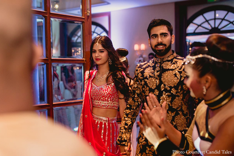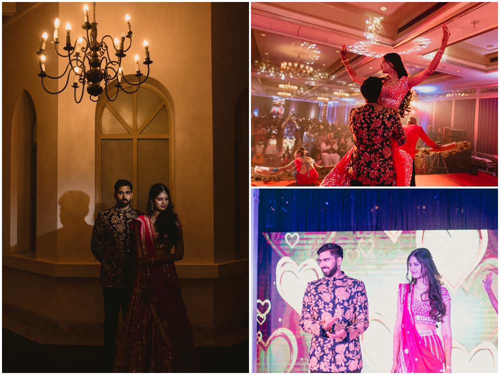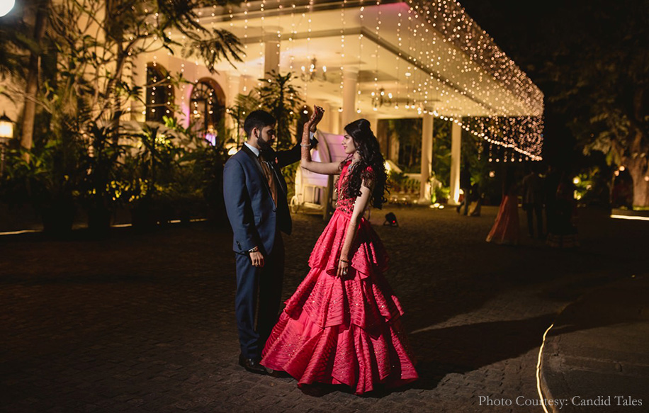 “We wanted our cocktail party to be a little different, so we decided to include dance performances at this event too. Elegant tufted white panels with ornate borders and a large floral wreath made for the backdrop of our stage. Pallav and I went for western attires for this function. I wore a tiered red gown by Shantanu & Nikhil while he opted for a classic black tuxedo.”