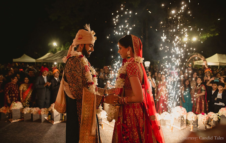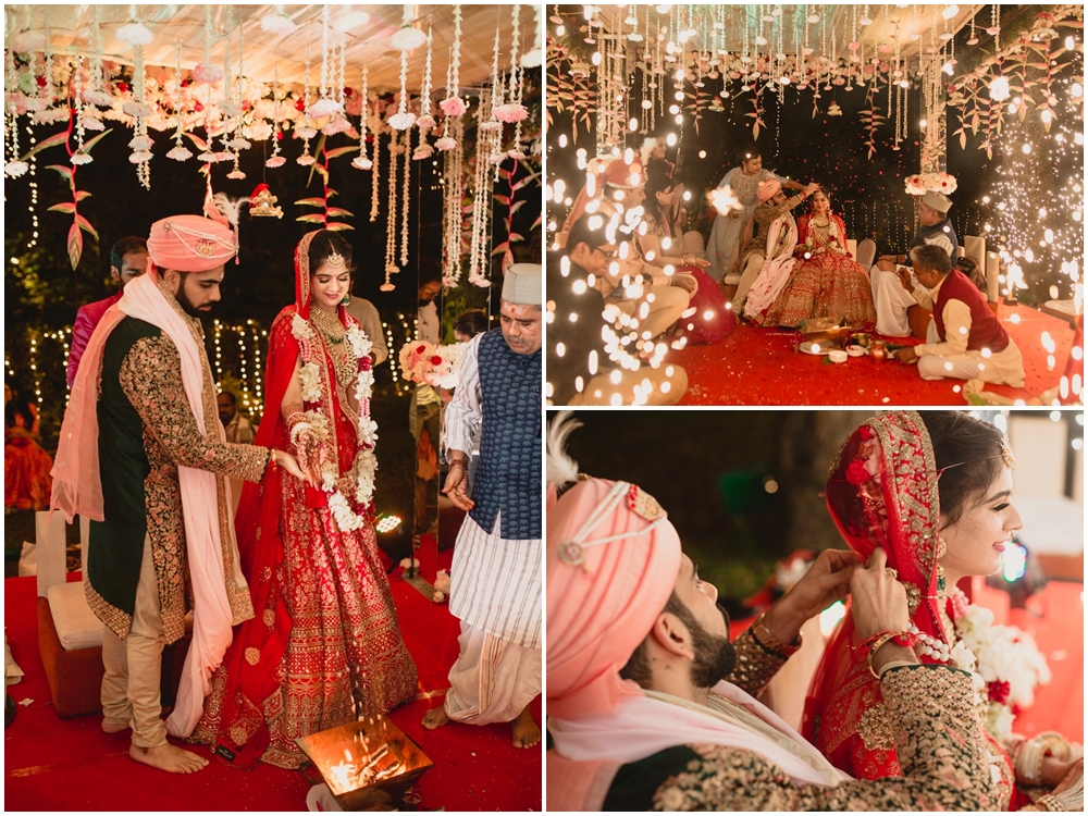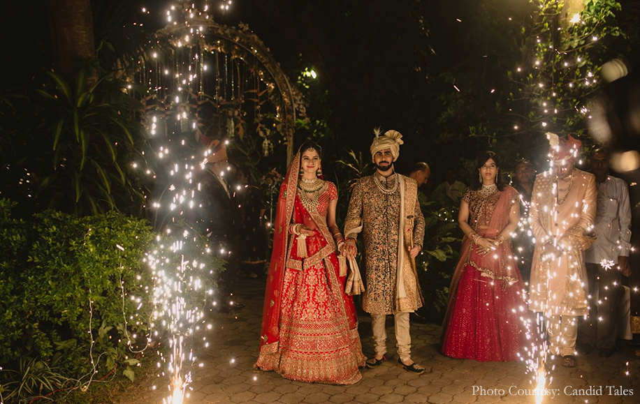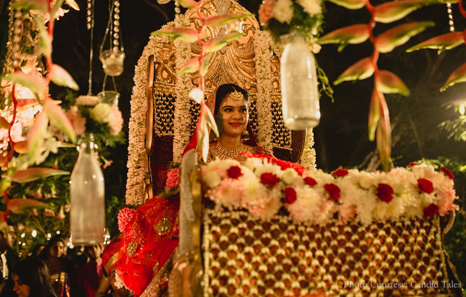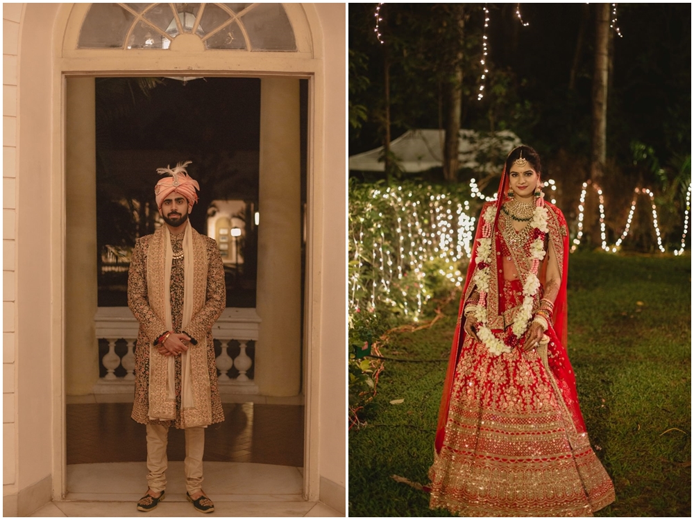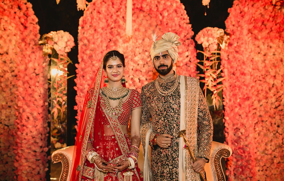 “Our wedding setup was simply breathtaking! Poonam Mayank Sharma transformed the space into something that was straight out of a dream. She used lots of fresh flowers creatively to enhance the beauty of the lush lawns at Taj West End, Bengaluru. The stage where we exchanged garlands had panels enveloped in peach blooms at the back and were alternated with mirrored pillars. The entire setup was bordered with two pillars, and an overhead fixture too was covered with pretty blooms. Large chandeliers added a classy touch to the setting. The decor at the entrance and mandap too followed a similar theme. I entered in a beautifully decorated palanquin and felt like a real-life princess.” For this ceremony, I wore a red lehenga by Sabyasachi, and Pallav picked a sherwani by Shyamal & Bhumika.”