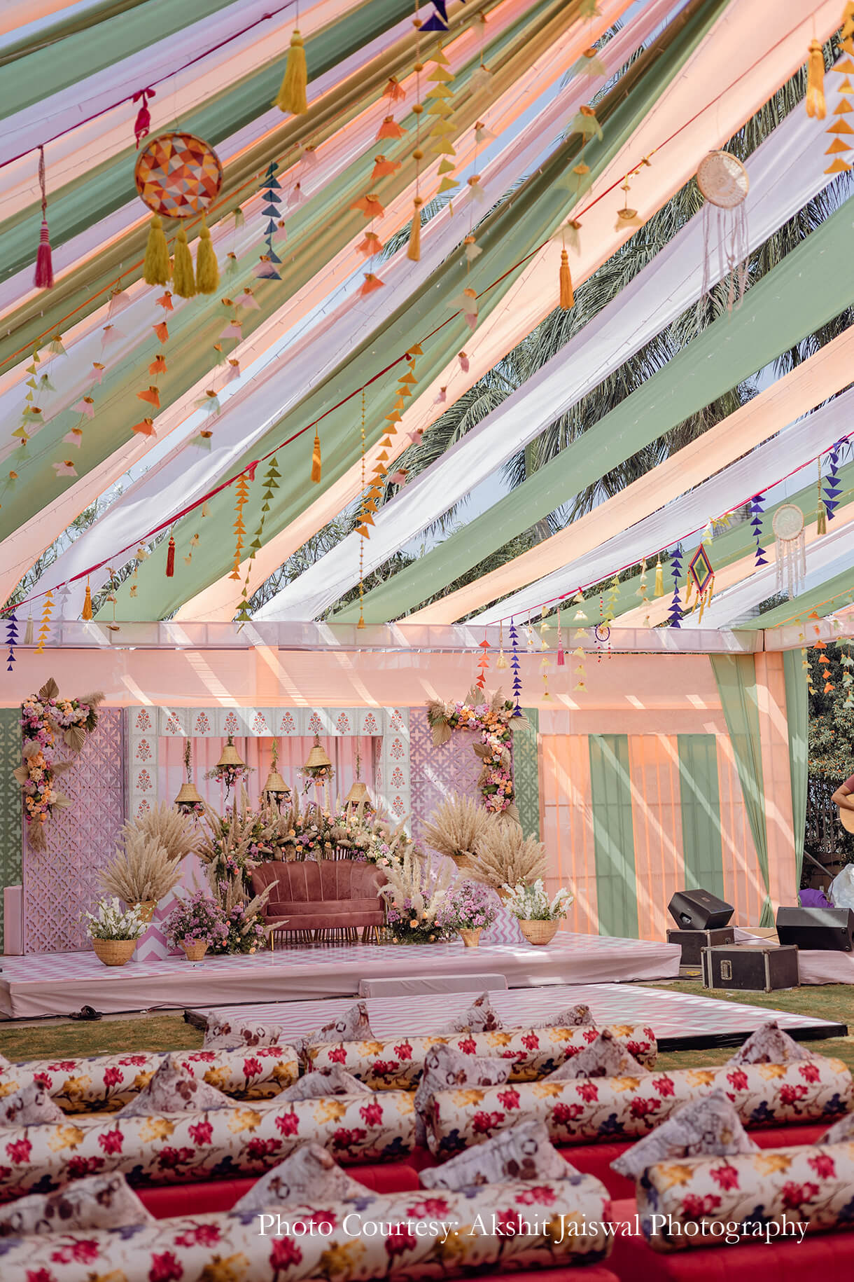 Adorned with flowers and pastel hues, the mandap exuded a soft glam and vintage boho vibes, elegantly combining traditional elements with new and innovative design choices like the dome-shaped photo booth. This blending of old and new perfectly captured the essence of the wedding, which aimed to honor age-old traditions while also embracing contemporary aesthetics.