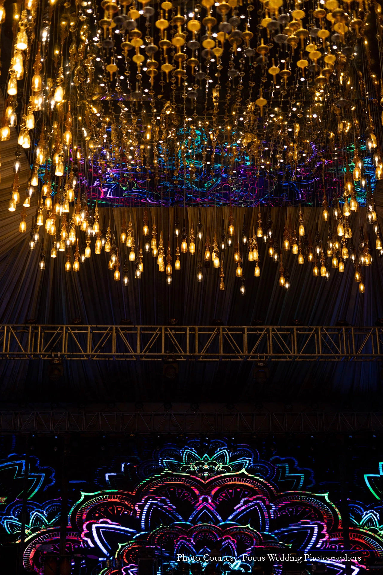 For the shagun and engagement, the couple took the glamorous route with a sleek color palette of blue that was accentuated by gold lights. Cold Pyros greeted the couple onstage as they made their entrance and gold sequins were suspended from the stage ceiling which added to the grandeur.