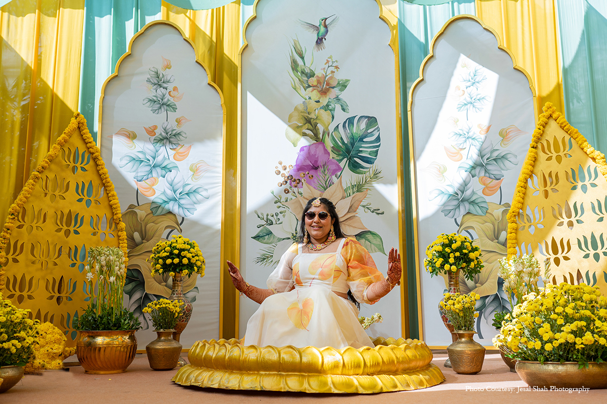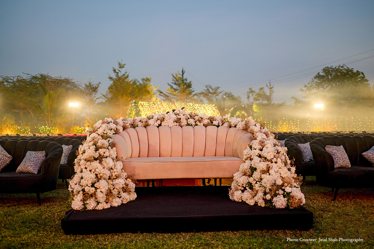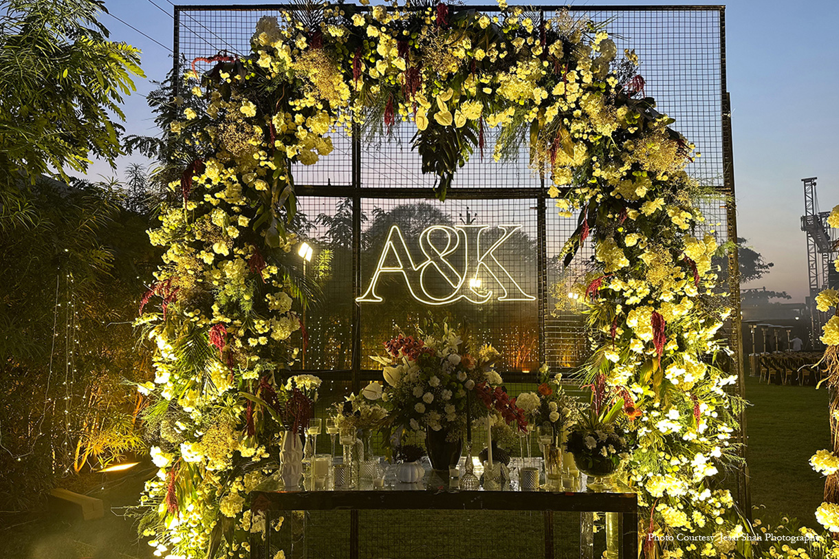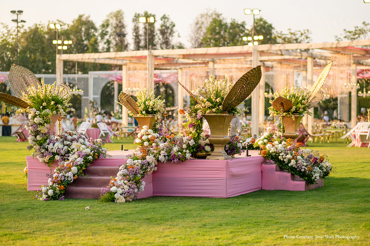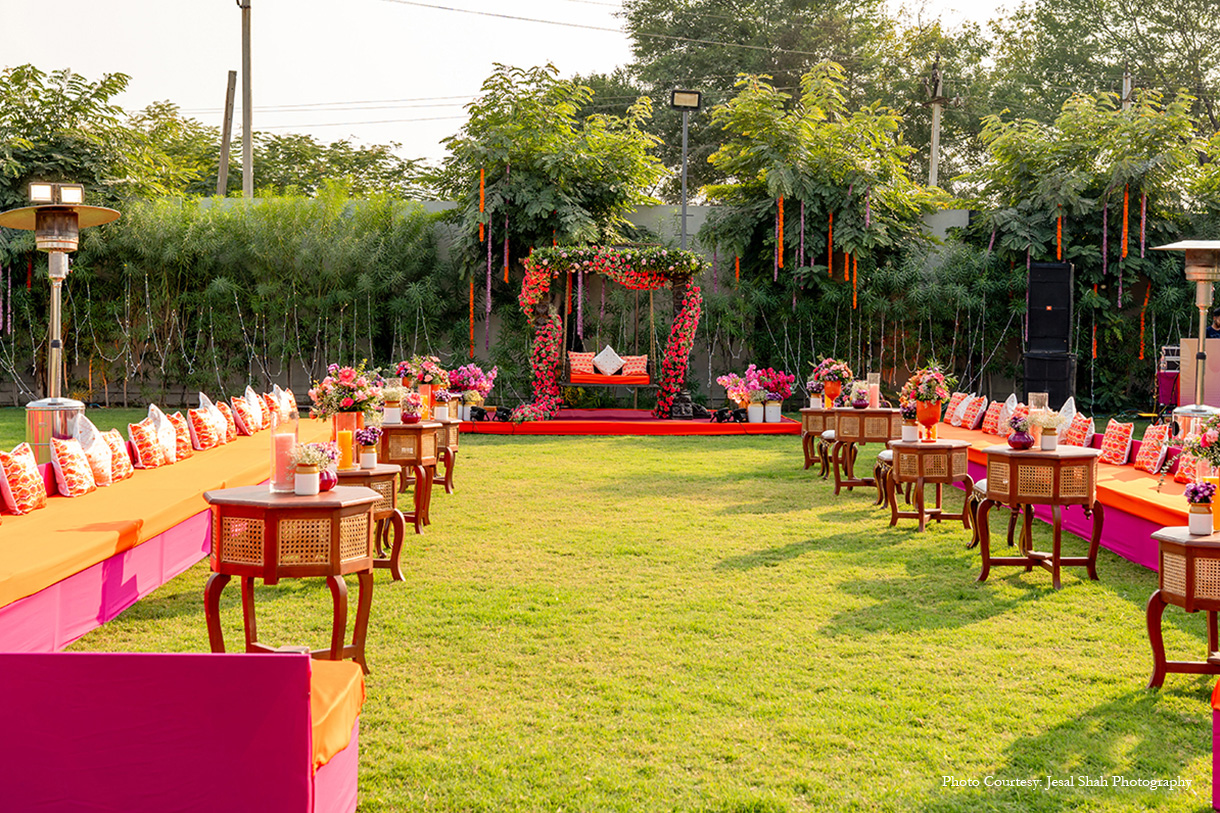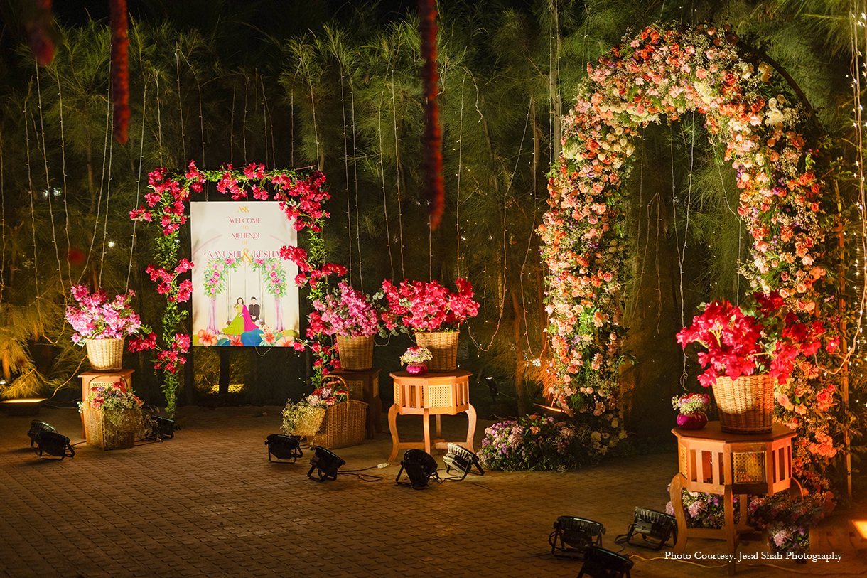 Meet & Vruti Shah from Celibraze Events & Entertainment shares, “The bride had requested a decor aesthetic that was in tandem with her outfits. Inspired by her wedding wardrobe we planned the color scheme for each event. For example, her outfit had anthurium prints for the haldi, so we also designed the same for her backdrop. All the designs were made by us from the get-go via multiple sketches and mock-ups. For the sangeet and mehndi at the family’s farmhouse, we were inspired by the rawness of the nature surrounding the venue.”