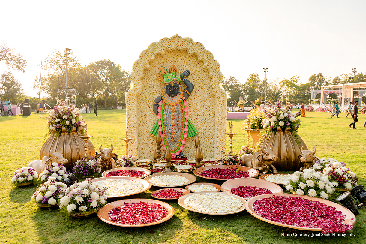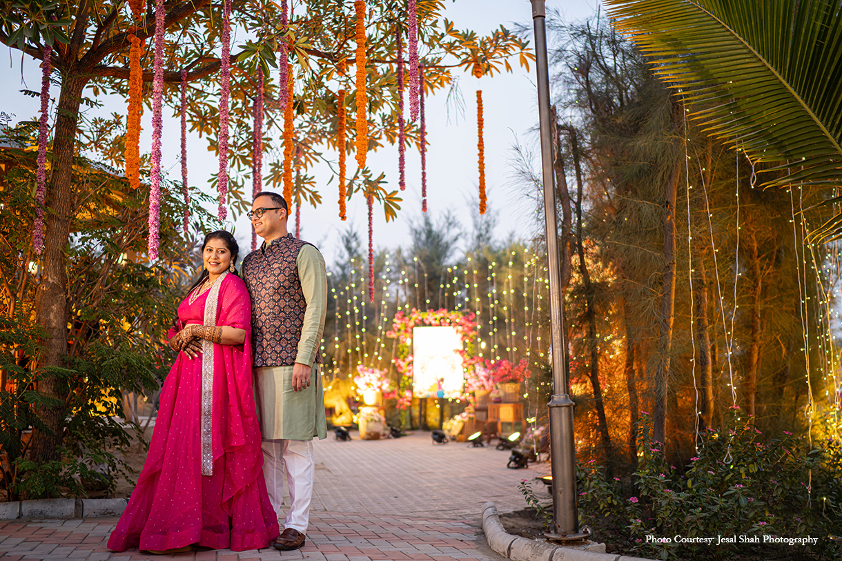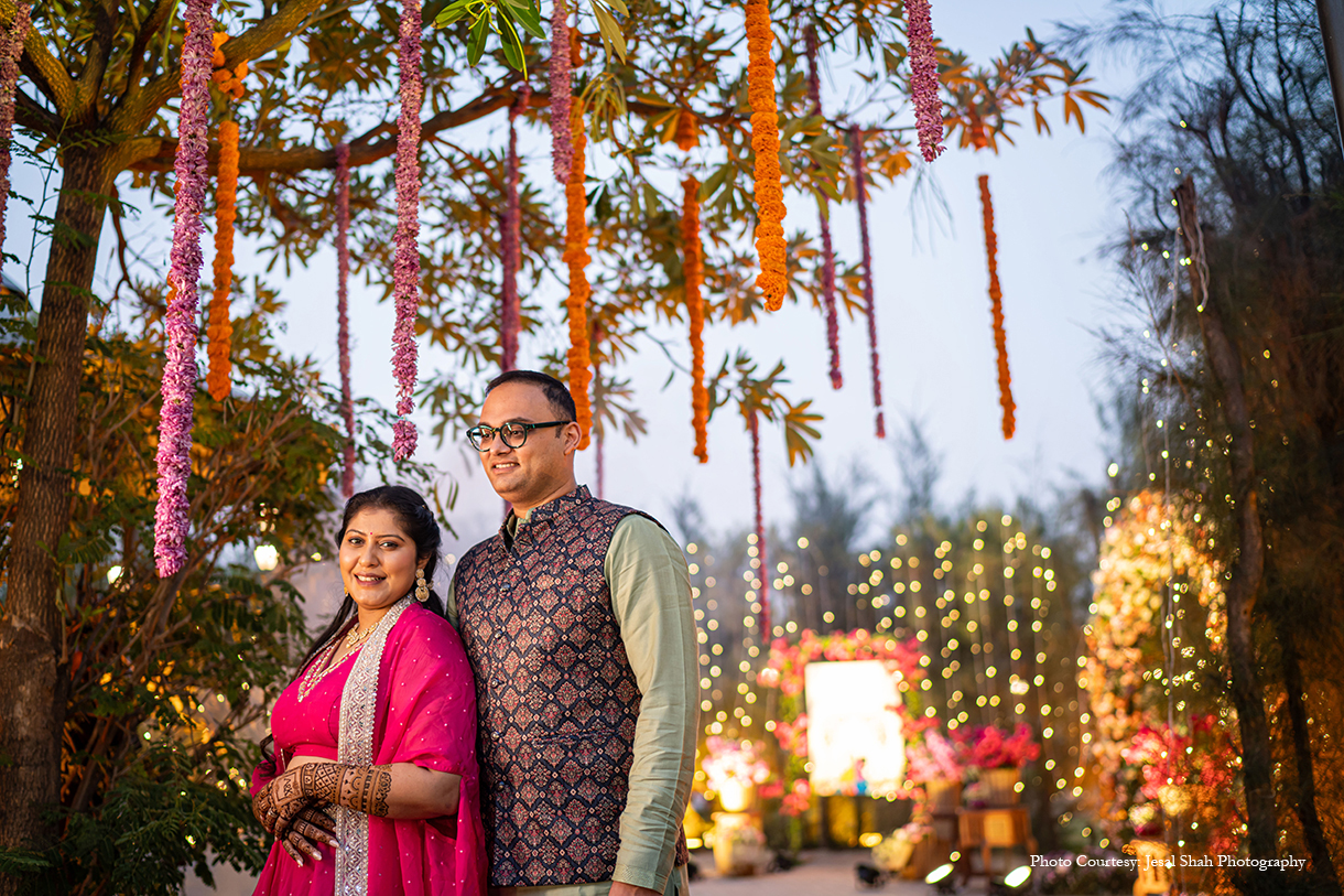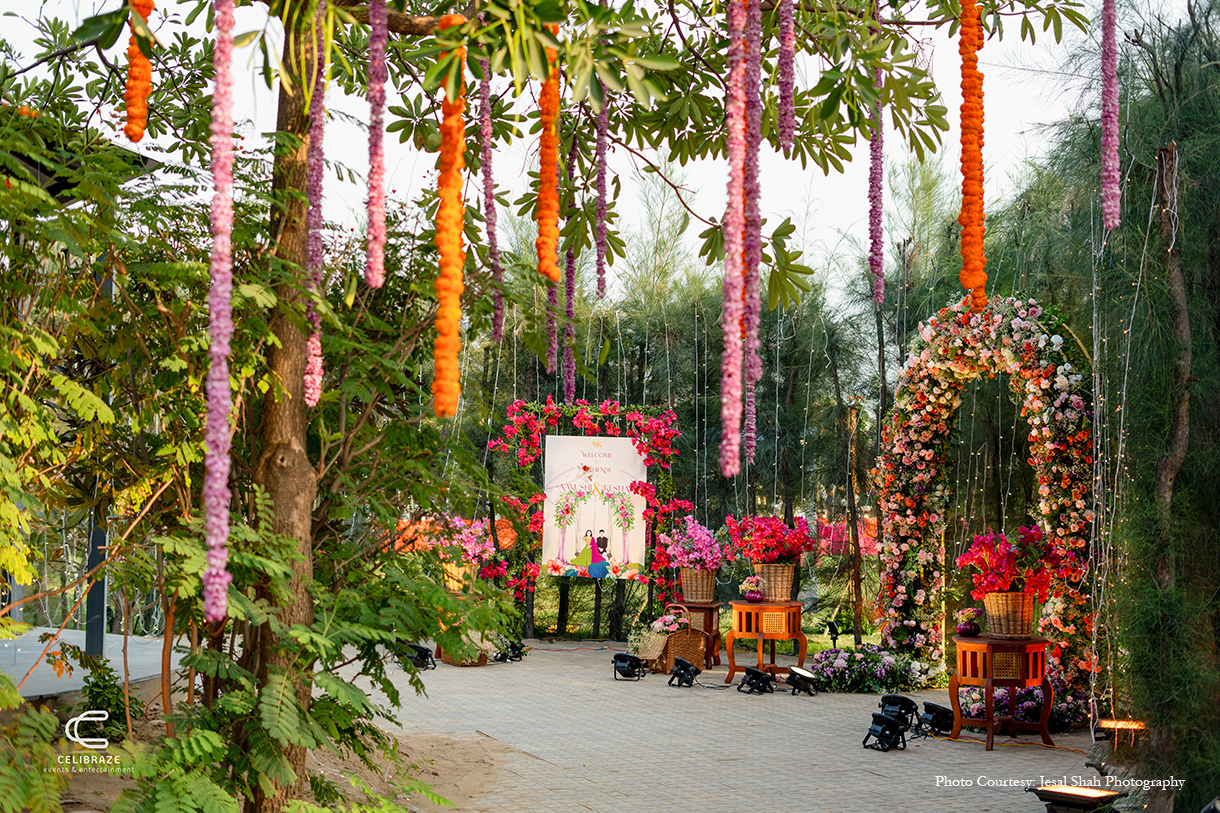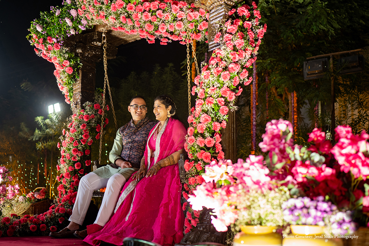 Meet & Vruti Shah from Celibraze Events & Entertainment shares, “The bride had requested a decor aesthetic that was in tandem with her outfits. Inspired by her wedding wardrobe we planned the color scheme for each event. For example, her outfit had anthurium prints for the haldi, so we also designed the same for her backdrop. All the designs were made by us from the get-go via multiple sketches and mock-ups. For the sangeet and mehndi at the family’s farmhouse, we were inspired by the rawness of the nature surrounding the venue.”