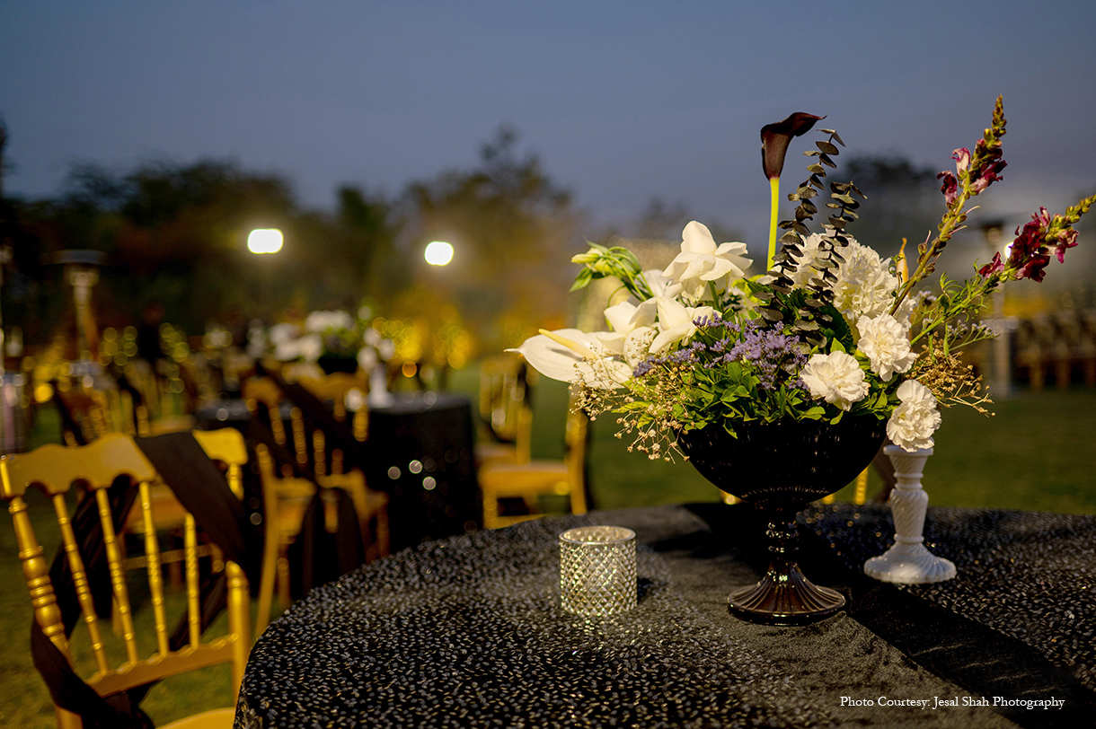 Meet shares, “The sangeet was based on a ‘Gold and Glitter’ theme. Hosted at the family’s farmhouse, size constraints were one of the few challenges we faced while orchestrating this event. However, we designed it in a manner that gave guests an immersive experience. We used glass props of different colours and arrangements in the whole entryway tunnel which also doubled up as a photo booth.”