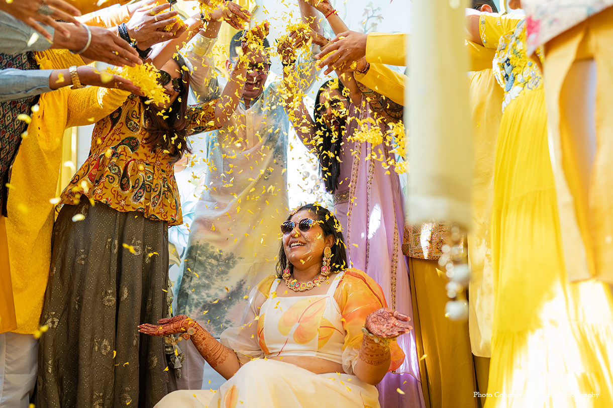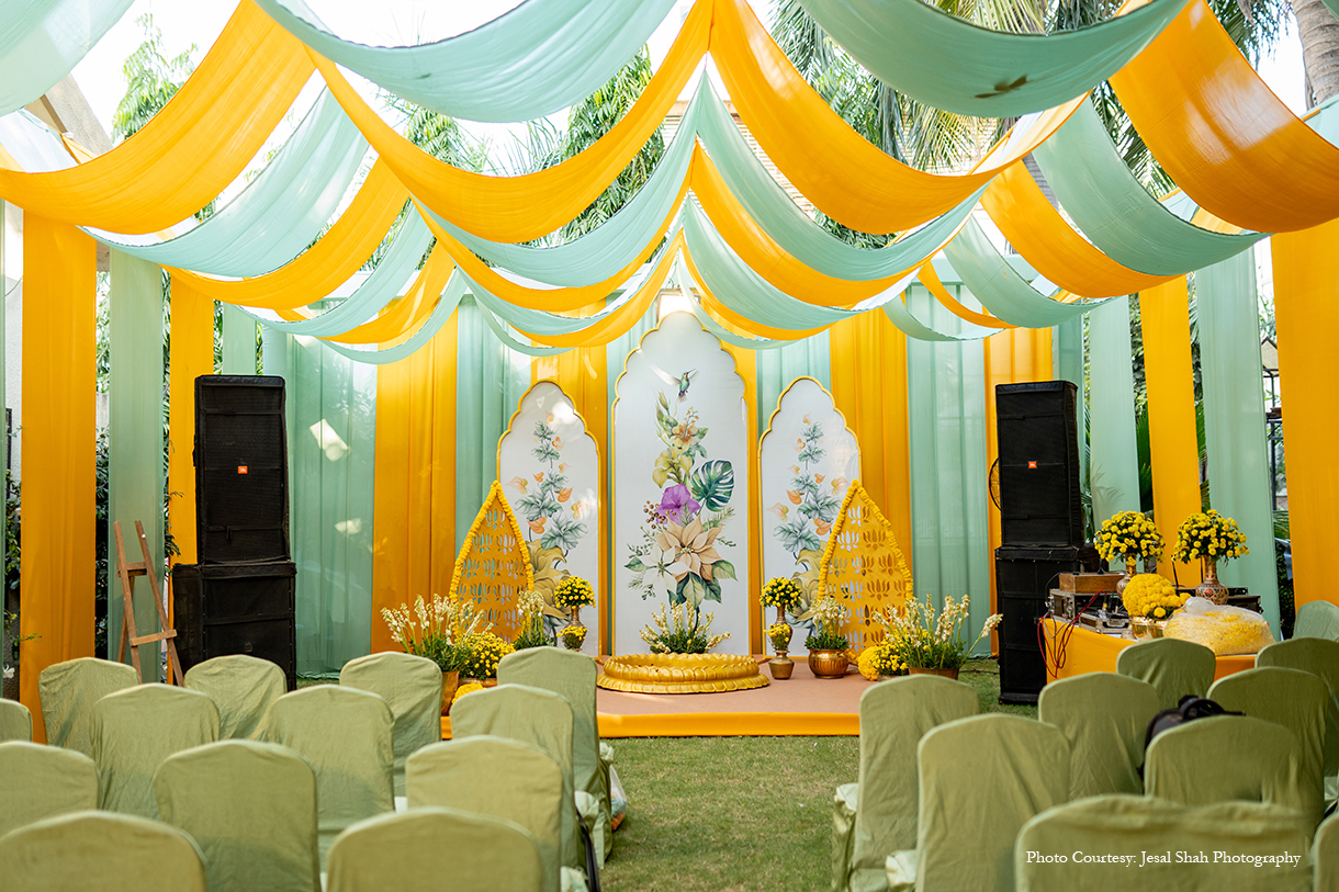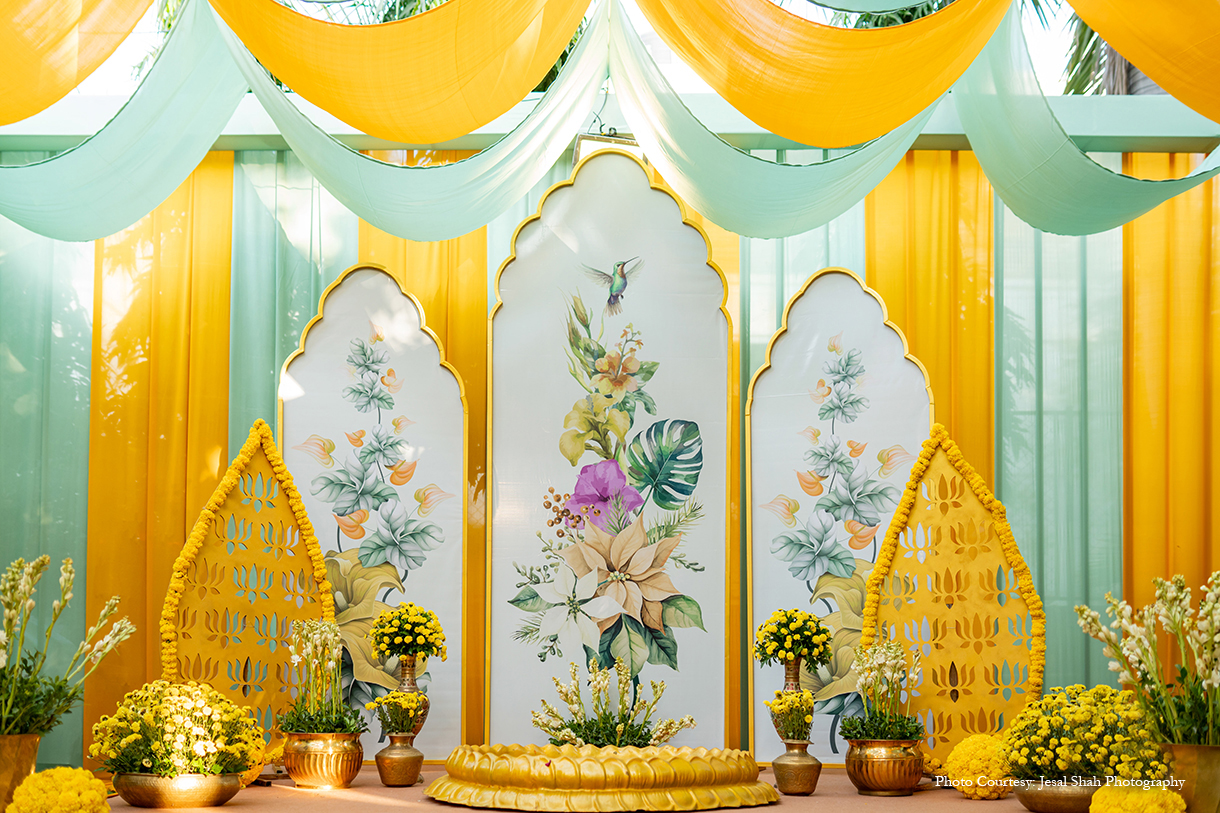 Meet shares, “For the Haldi we took a cue from the bride’s outfit which featured artistic floral prints. Marigolds, backdrops inspired by anthuriums, floral arches and brass vases brimming with blooms made for the perfect setup. Drapes in soft yellow and sea green hues sheltered the guests from the sun as they playfully slathered the couple with haldi.”