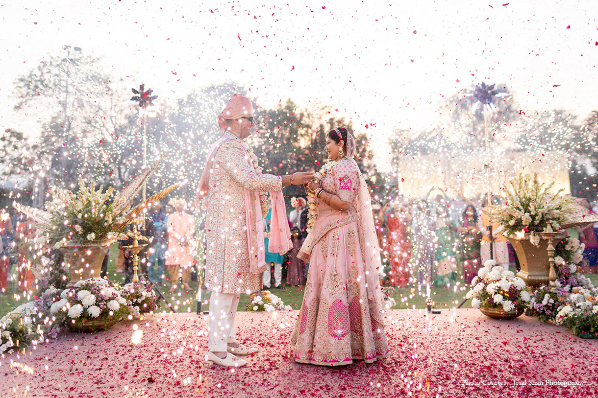 Traditions took the front seat on the big day with a decor that was classic and serene. Pink and white hues cut a stunning contrast with the lush greenery of the venue. The mandap featured cutwork designs and suspended florals. The varmala took place during sunset and Aayushi’s bridal entry was punctuated by the chiming of miniature bells rung by the guests.