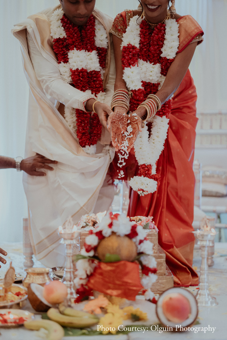 For the Hindu wedding ceremony, the couple stayed true to tradition and chose customary colors of red and white for the theme. The baraat’s entry, with the groom astride a horse, was a merry procession with music and dance. The traditional ceremony took place in a gorgeous mandap where the blessings of the deities were invoked to bless the union of the couple. The groom donned a traditional white and gold mundu and kurta, and the bride looked radiant in a silk Kanjeeveram saree which she paired with temple jewellery. The duo exchanged gorgeous garlands of red and white flowers.