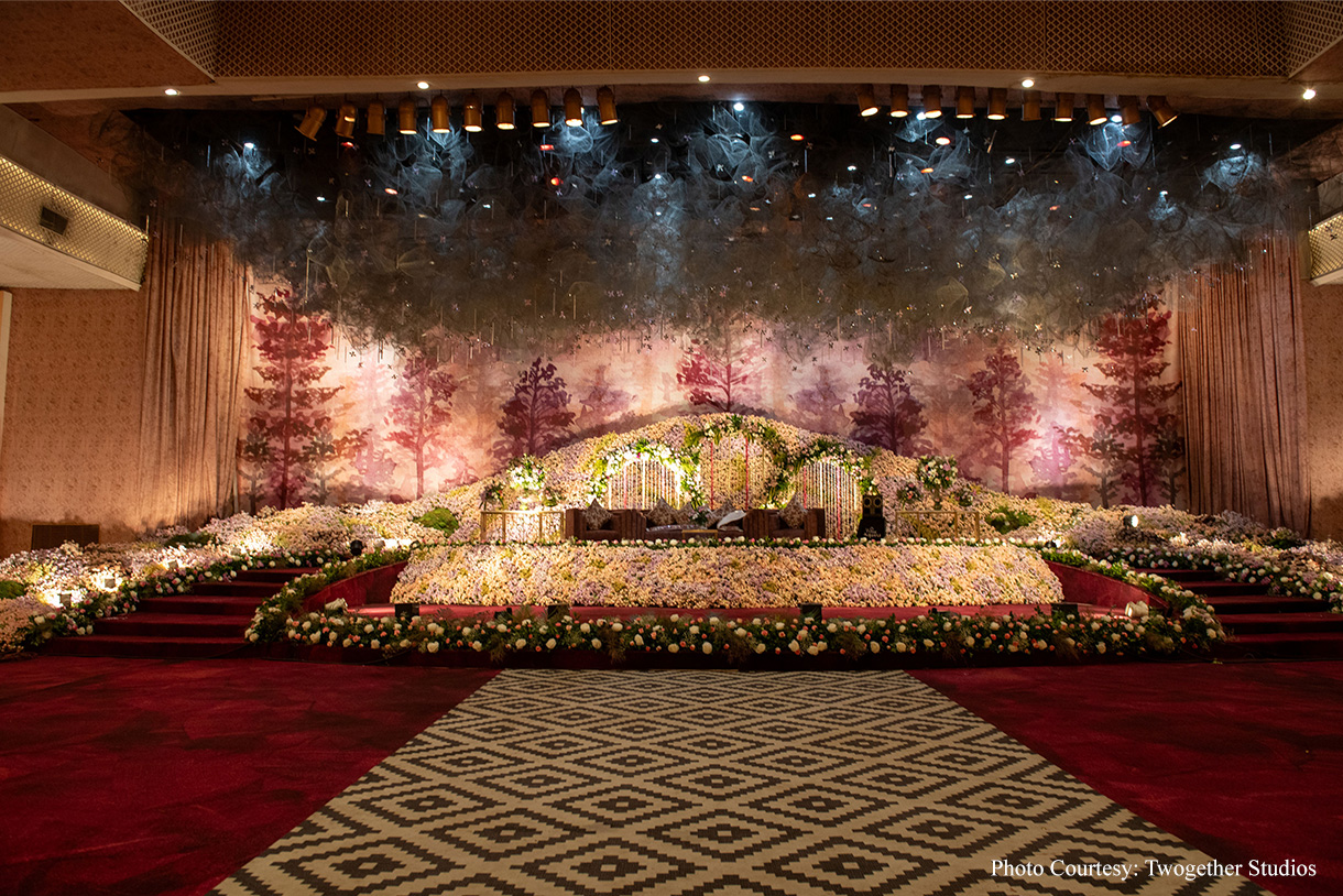 For the wedding, the couple chose to go for a dreamy floral decor with shades of rich red to accentuate the pastel tones. Floral arches adorned the stage, a moody forest-inspired backdrop and warm lights created an inviting yet magical ambience.