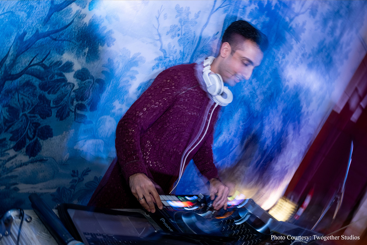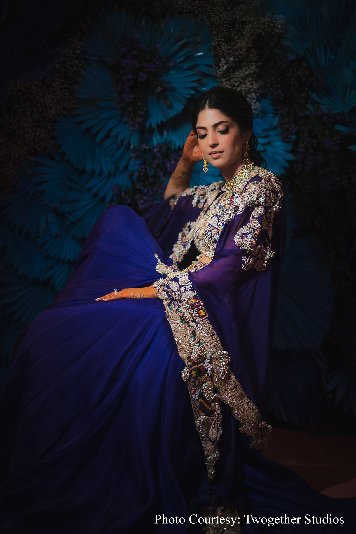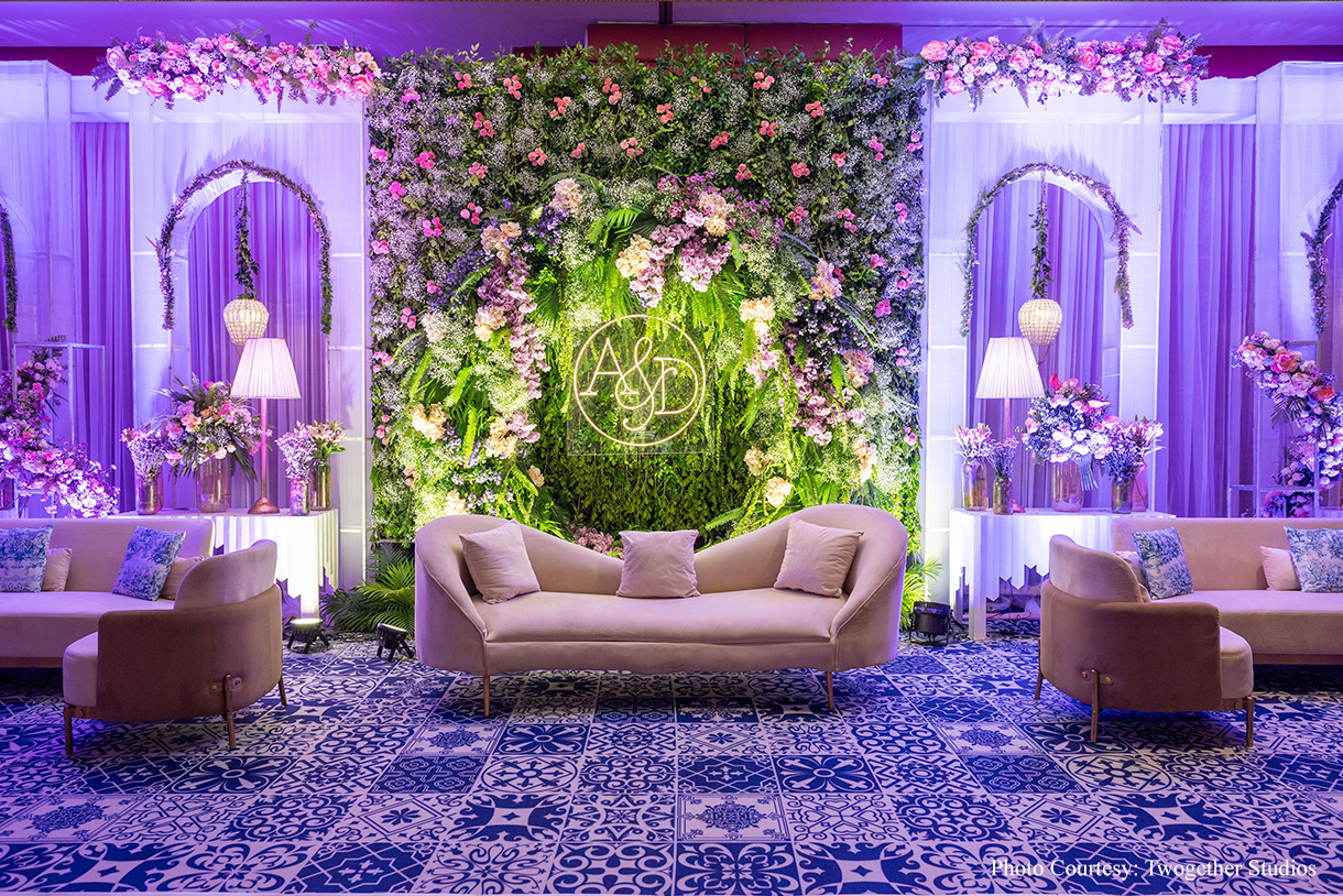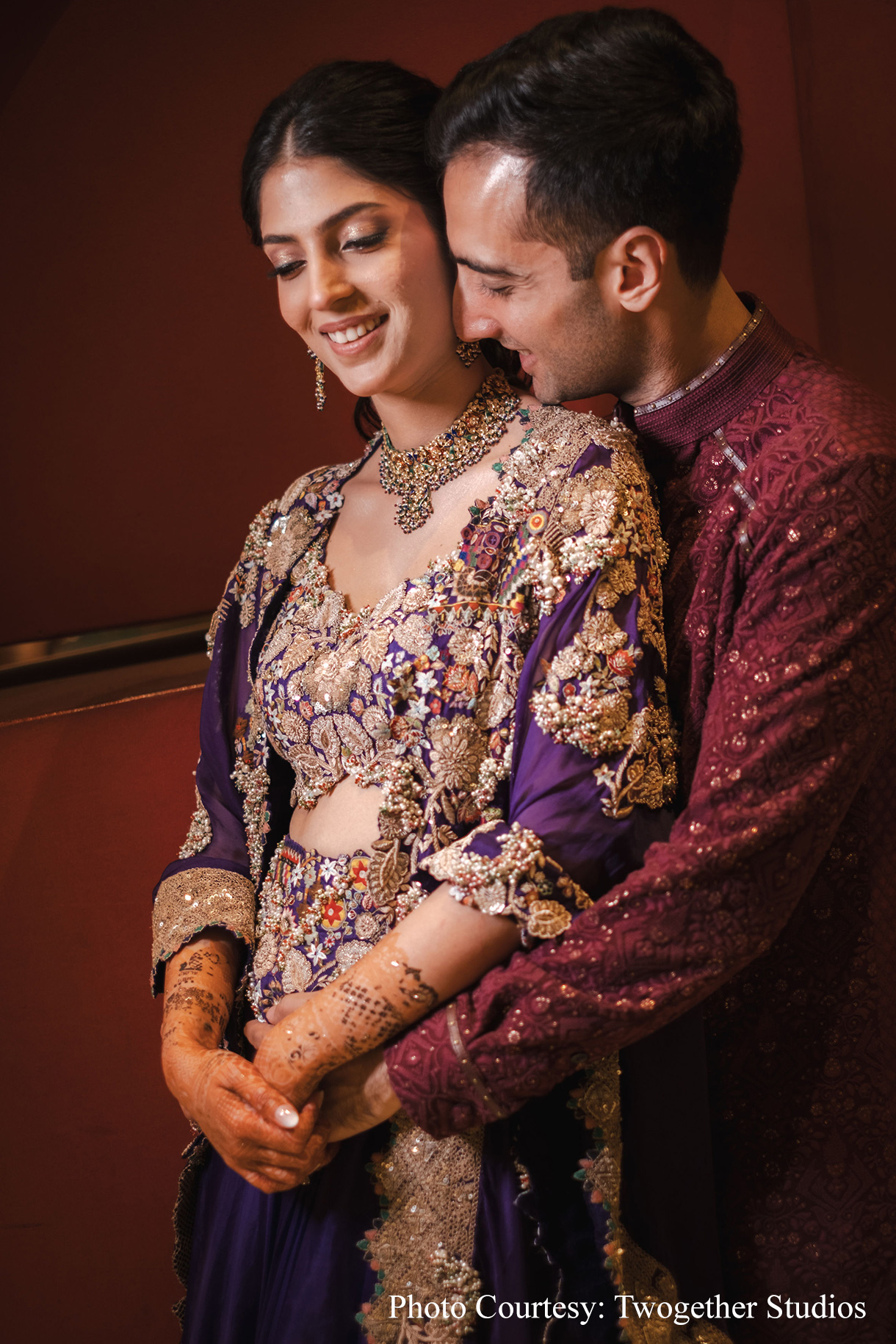 Bedecked with vibrant blooms and colorful backdrops the mehndi carnival had everyone shaking a leg. Majestic chandeliers lit up the entryway and the mix of purple and silver lights set up a magical ambience. Later, the groom took over the DJ console and entertained the packed dancefloor.