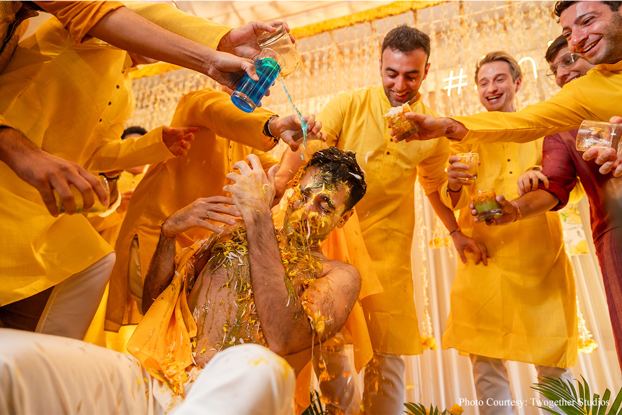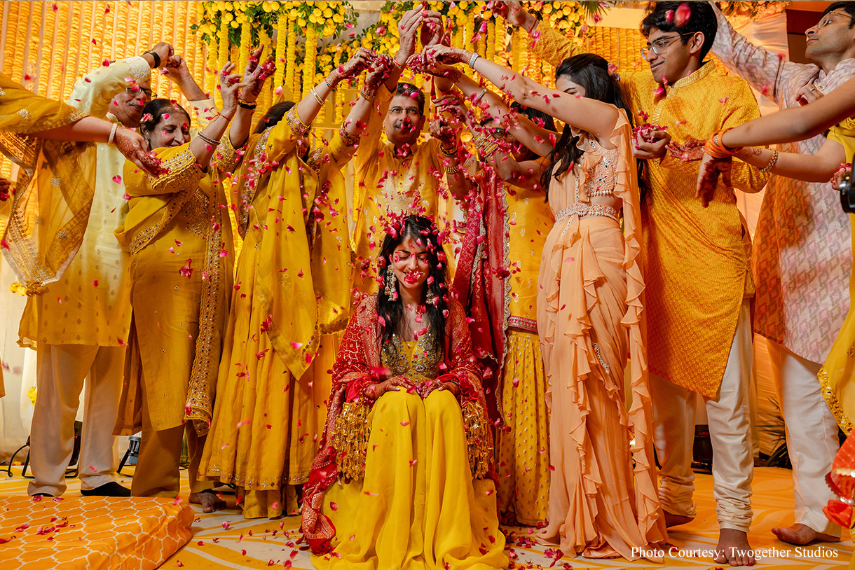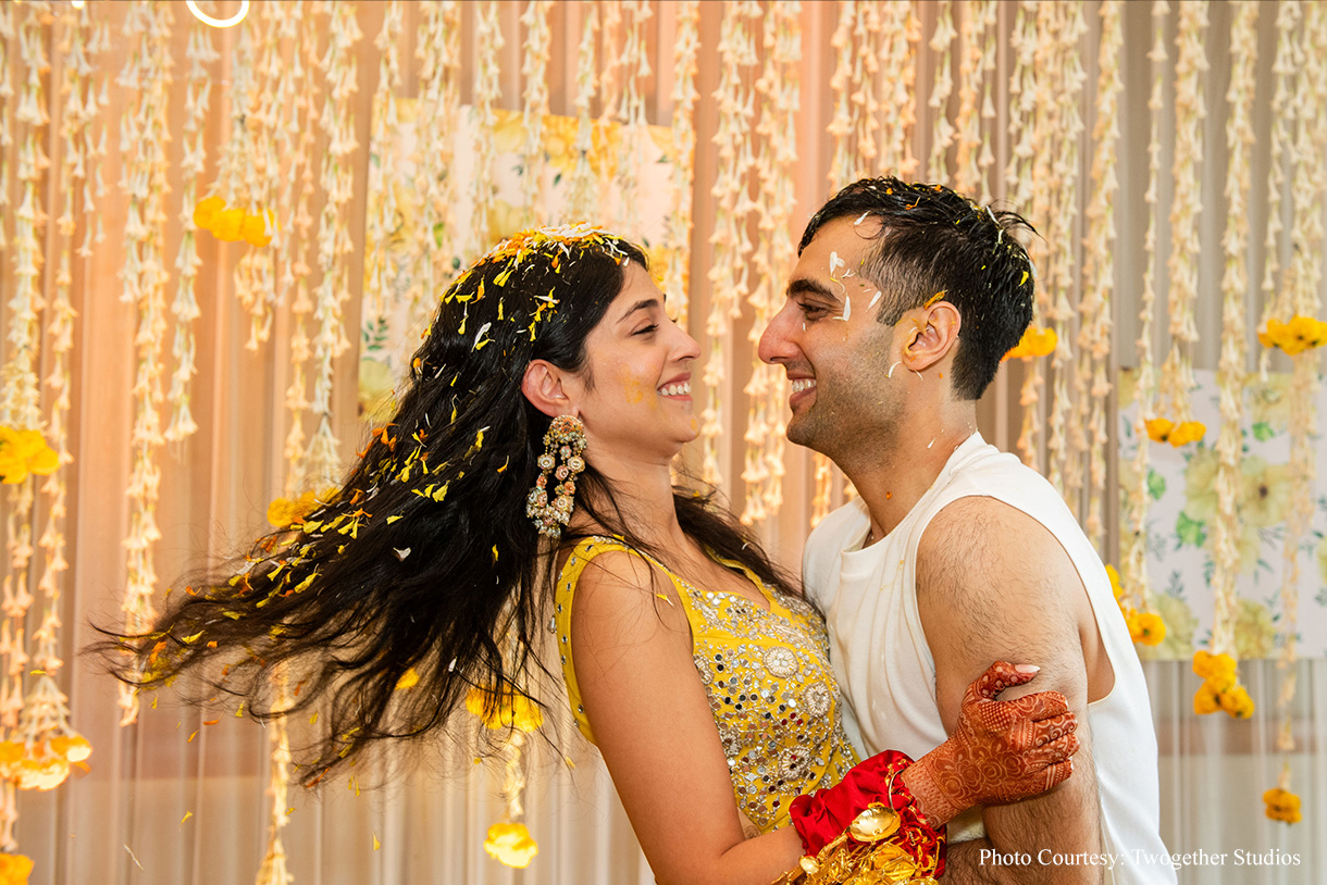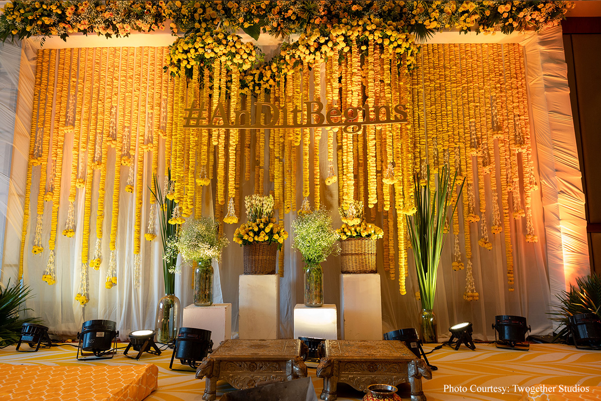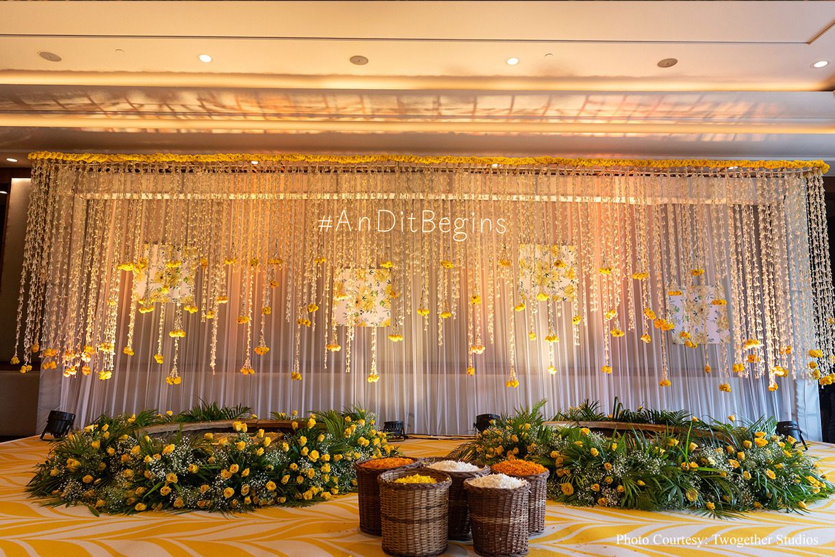 Using a vibrant palette of yellow, green and white, the haldi was a playful celebration. A flower shower and candid banter resulted in picture-perfect moments against the floral backdrop, which also had the couple’s hashtag.