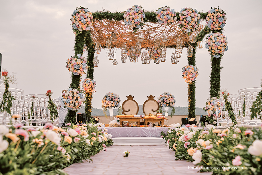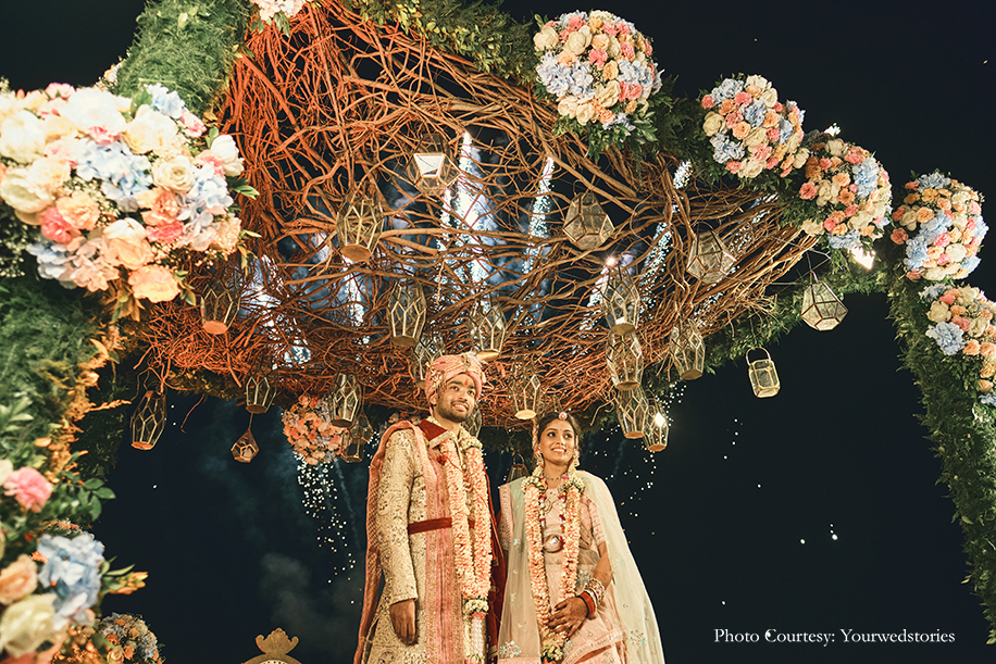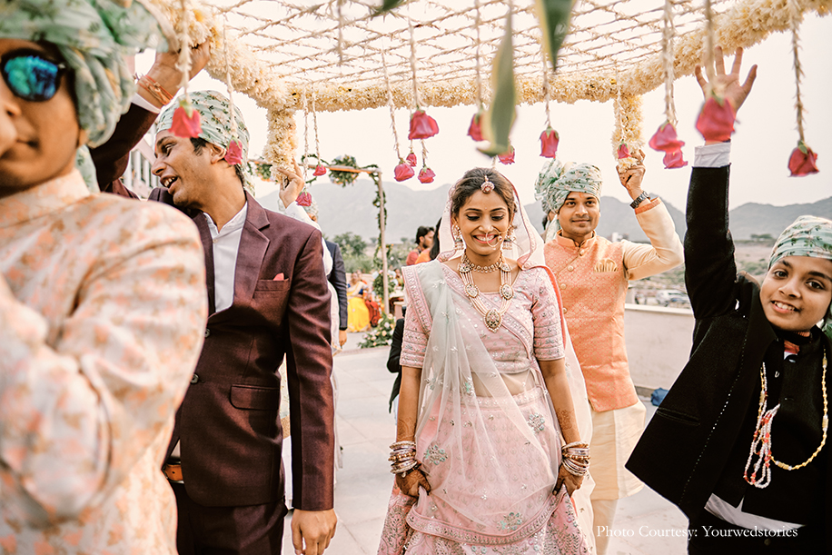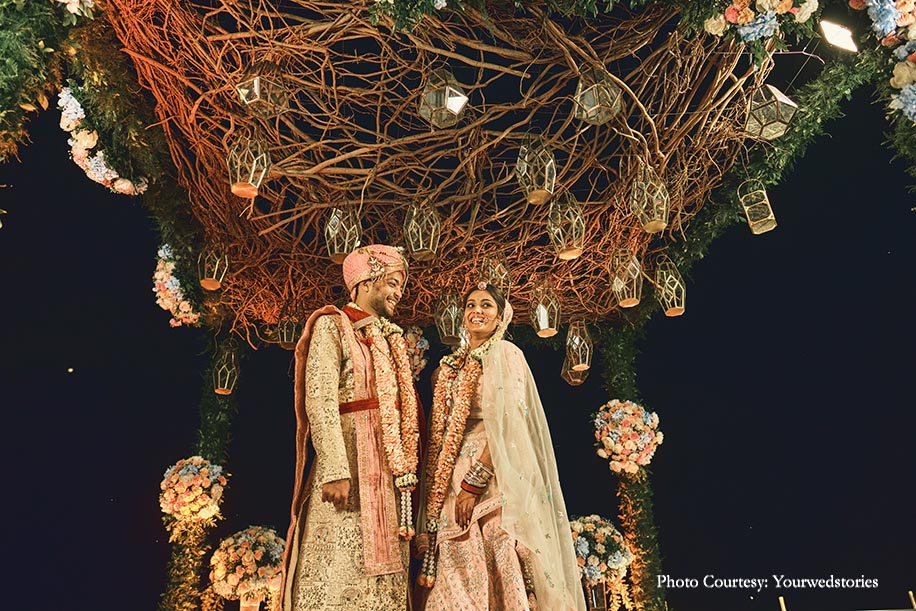 Romantic pastel décor, a mesmerizing floral mandap, ringing bells and fresh flowers took the couple’s vision of their dream wedding to new heights. The bride looked resplendent in a gota patti lehenga with delicate threadwork in pink and mint green which she accessorized with a meenakari rani haar and a family heirloom rakhdi. The groom complemented her look in a cream sherwani with multi colored thread work.