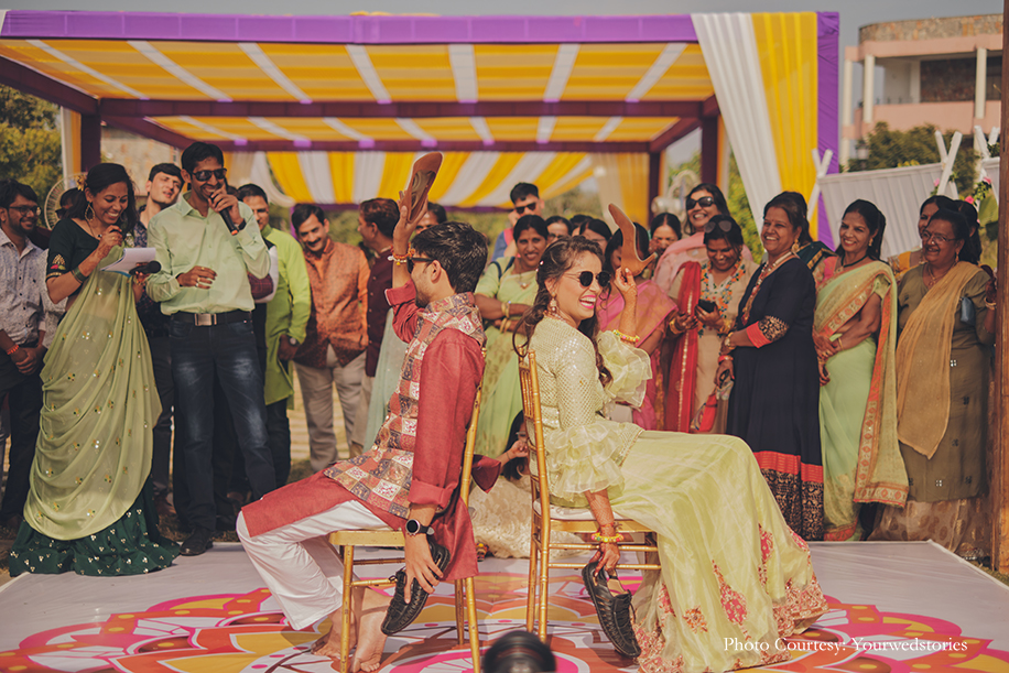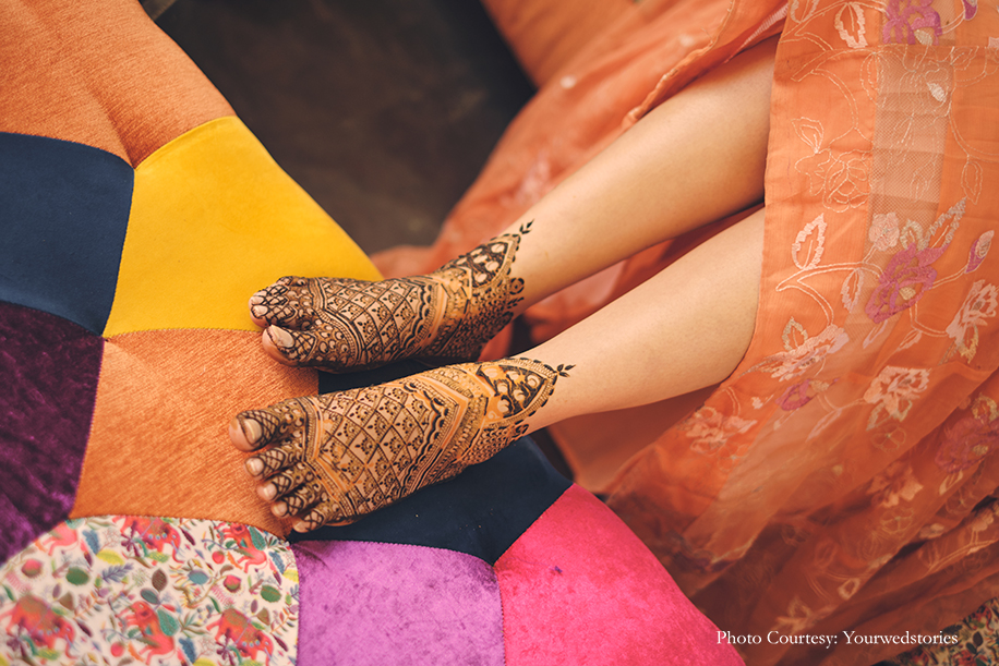 With myriad colors lighting up the festivities, the Mehndi was planned with the zest of a vibrant carnival. The bride donned a mint-green lehenga with exquisite zardozi work and a ruffle sleeved angrakha top, accessorized with a statement neckpiece with jade stones and gold inlay. The groom contrasted in a red kurta and a multi-color printed Bandi jacket.