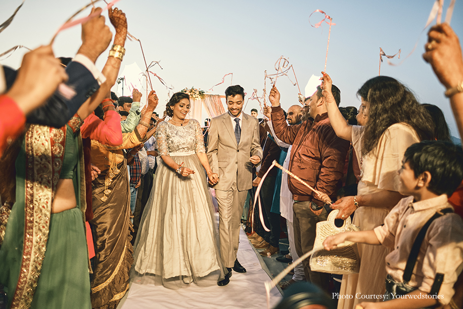 The final wedding reception was minimalistic which involved a beautiful cake cutting accompanied by cheerful revelries. The couple looked stunning in contrasting attires of red and blue. The night ended in a spectacular display of fireworks.