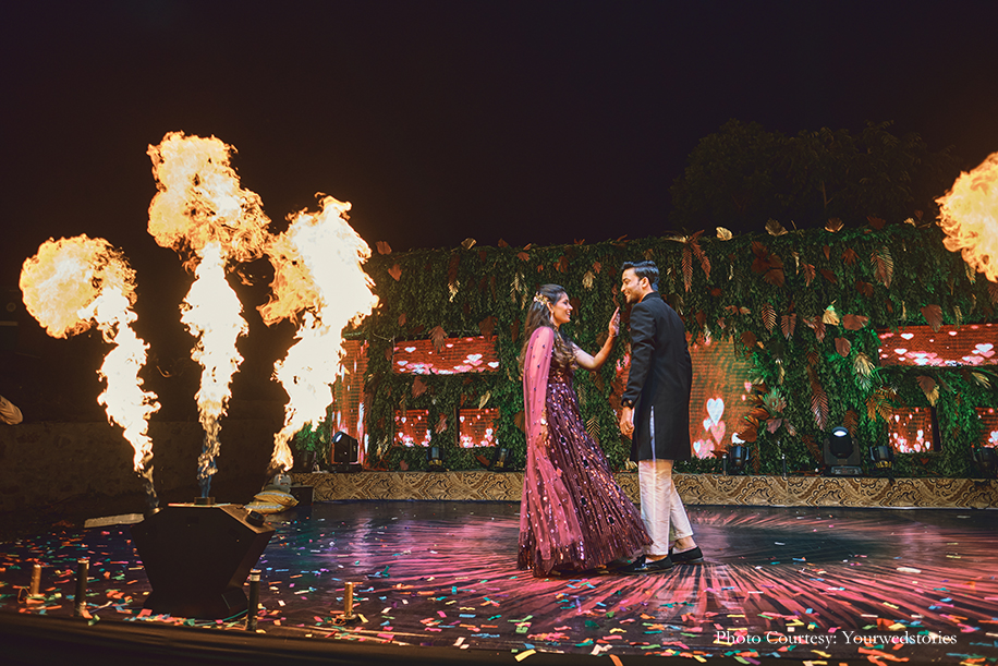 With all the pomp and splendor of a Rajasthani Sangeet, the night saw glamour, Bollywood flair and a whole lot of dancing. The bride, who had always envisioned wearing a rich purple outfit, wore a stunning flowing gown with sparkling sequin work and flared sleeves. The groom looked divine in a black achkan paired with a striking red pashmina.