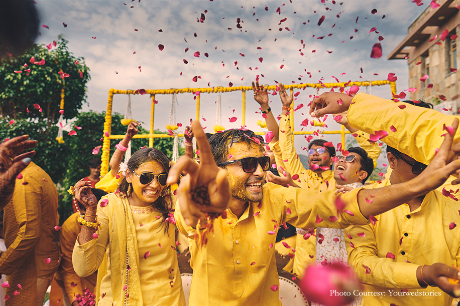 The most cherished event of the wedding, the Haldi function was a cheerful blend of whimsy and color that made for an unforgettable experience. White and yellow balloons teamed with a profusion of flowers filled the venue, while beautiful bubbles filled the air.