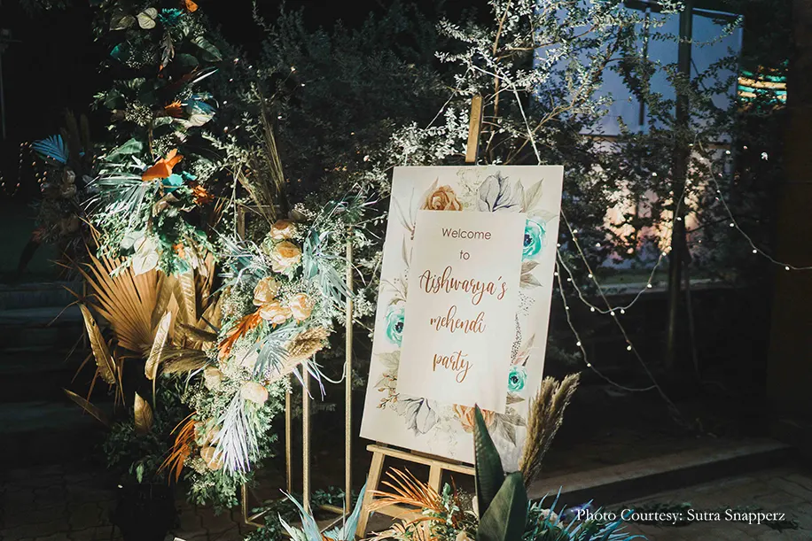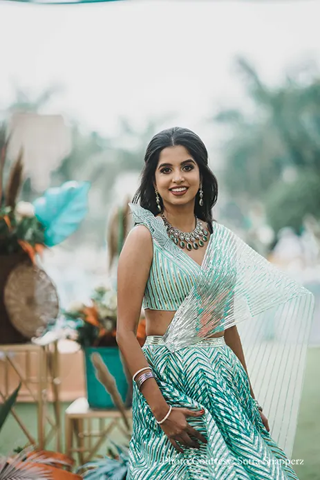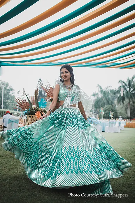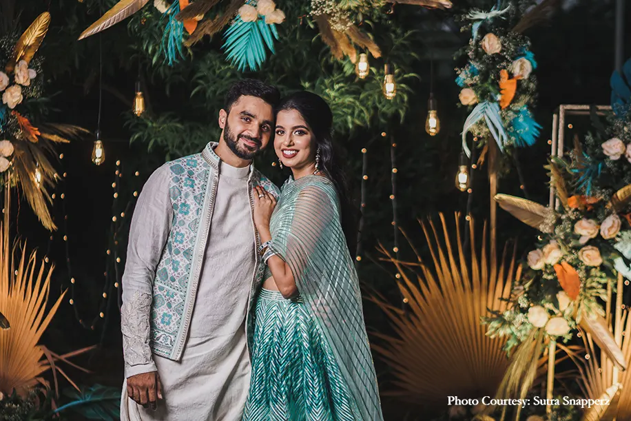 The festivities started on a fun note with a lively outdoor mehndi ceremony full of activities and enjoyment. Mehndi artists, coconut drinks and more, set a laid back environment, while an earthy decor palette with drapes and arrangements of leaves and pampas grass exuded a boho-chic vibe. The bride sported an edgy structural lehenga in a cool aqua green which the groom duly complimented in a Kurta set from Shantanu and Nikhil.