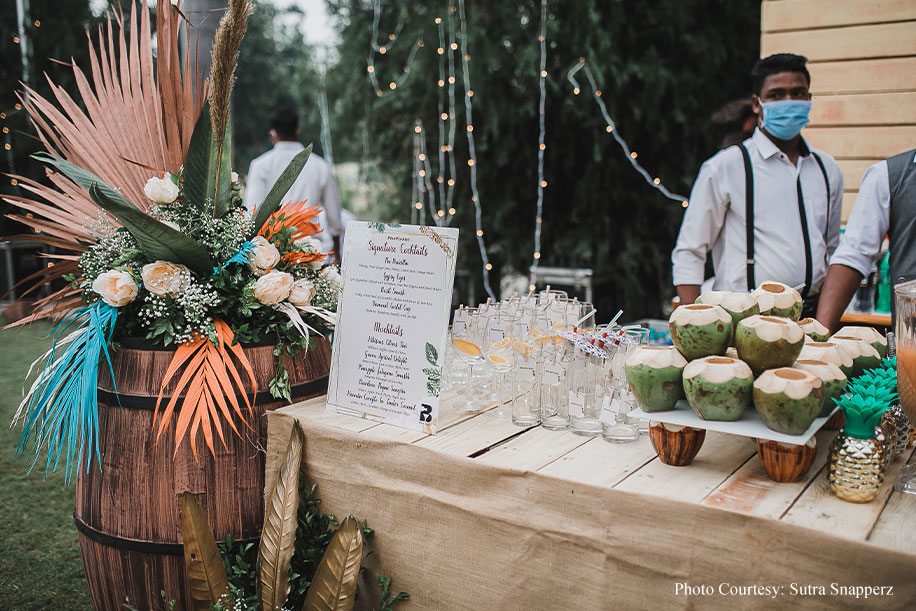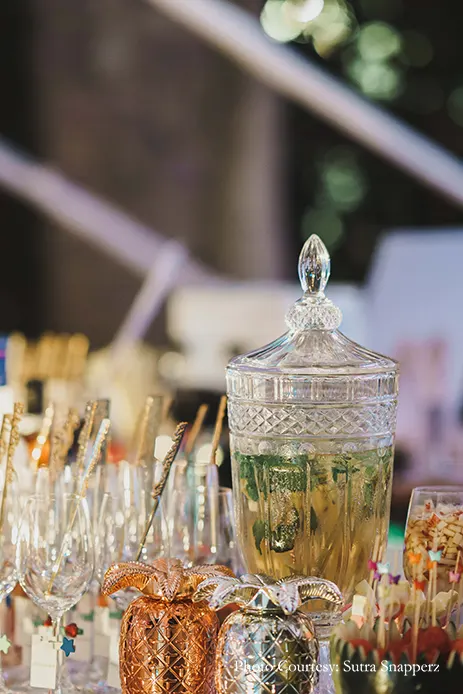 The cocktail night was an elegant soiree at the groom’s home with a chic garden setup of flowing drapes, chandeliers, magical lights and sparkling crystals. The bar stole the show, offering their guests unique custom cocktails curated by Mumbai-based The Wedding Bartenders. The bride dazzled in a concept saree from Tarun Tahiliani while the groom wore a bandhgala set from Anita Dongre.