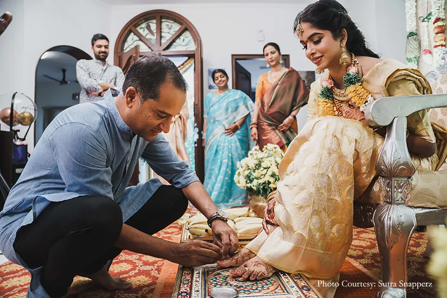 The traditional ceremonies of Pellikuthuru and Pellikoduku held at the bride and groom’s homes were intimate family events with minimal yet charming floral decor and warm family moments. The rituals were followed by lunch and merriment. The bride wore a Banarasi saree from Raw Mango and the groom wore a kurta set from Abu Jani Sandeep Khosla.