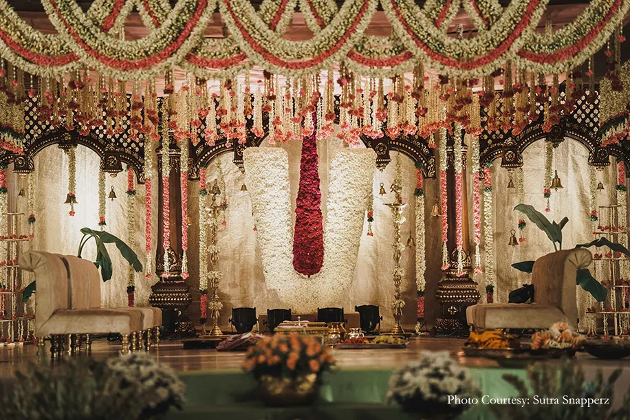 Aishwarya wanted the wedding ceremony to be a blend of traditional and modern with a lotus theme which was beautifully implemented by the decor team. The serene ceremony saw a lovely pastel palette of pink, white and green, with intricate floral decor that put a delicate contemporary spin on traditional aesthetics, right from the aisle and mandapam to the choir from Tirupati. The bride wore a Kanjeevaram saree from Tulsi Silks which was then embroidered by designer Jayanti Reddy, and the nuptials were quaint, calm and truly memorable.