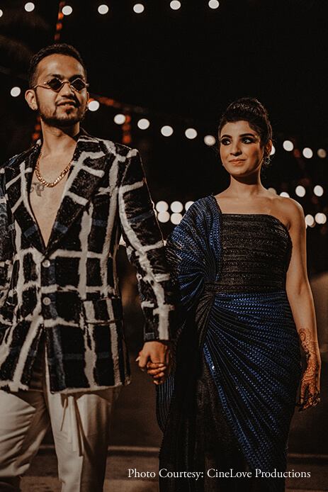 Following a ‘Glitz and Glamor’ theme, the ring ceremony and cocktail dinner boosted the glamor stakes with its dazzling decor. Held under the dark, starry skies, the function venue, surrounded by lush foliage, was lit up by the soft glow of vintage light bulbs. For this chic event, Aishwarya donned a one-shouldered blue sequin gown, while Himanshu wore a velvet checkered blazer.