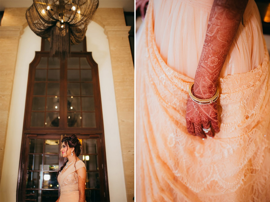 The bride wore a beautiful voluminous peach and cream gown by Shantanu and Nikhil, which she paired with pretty silver jewellery.
