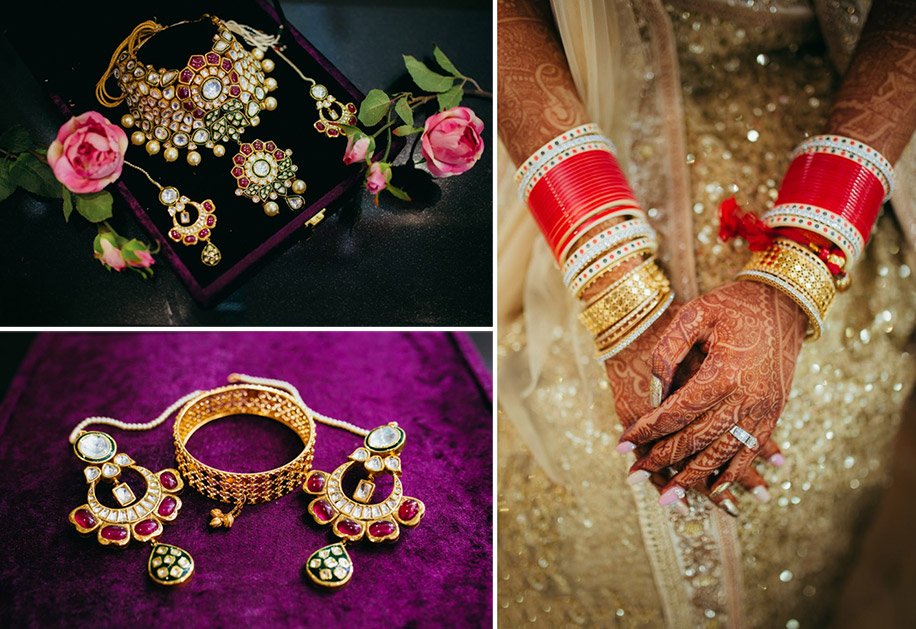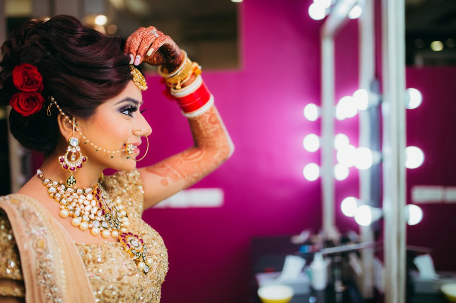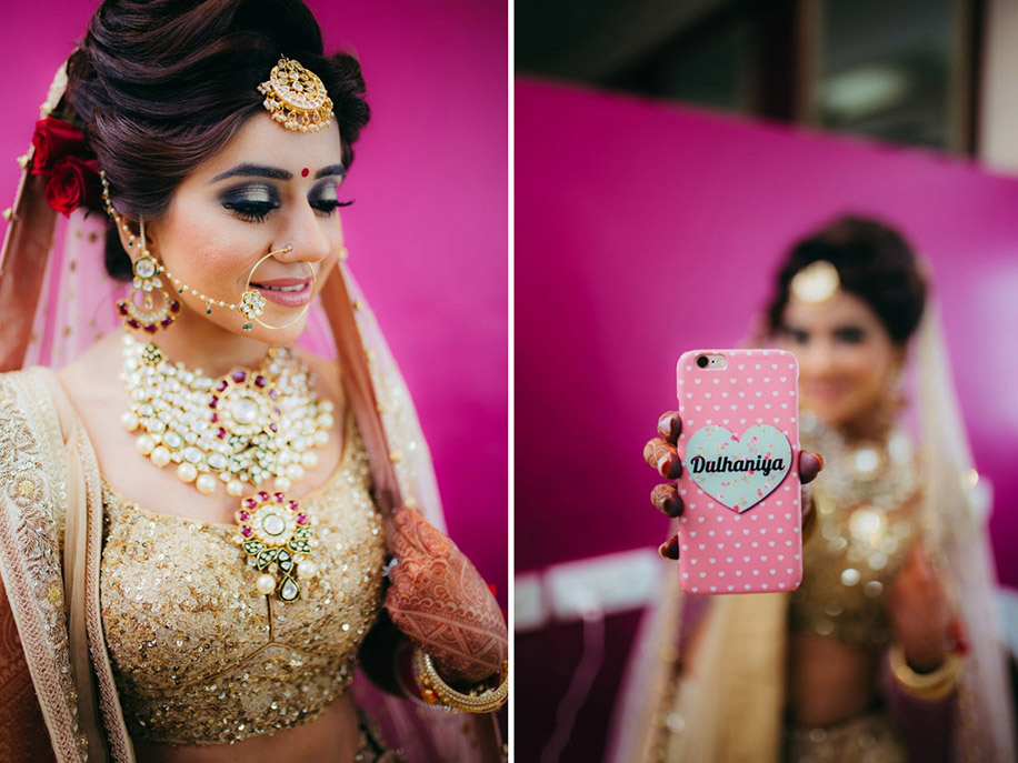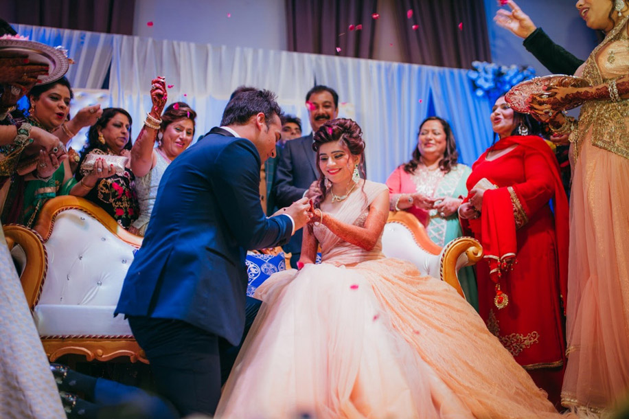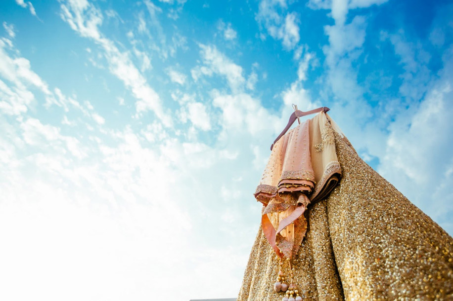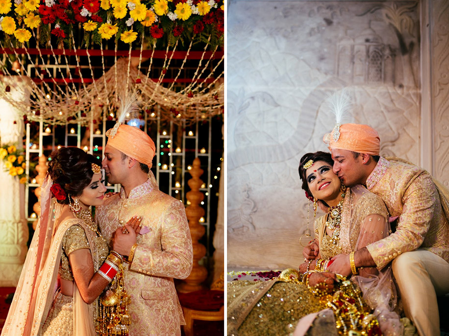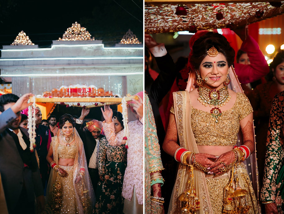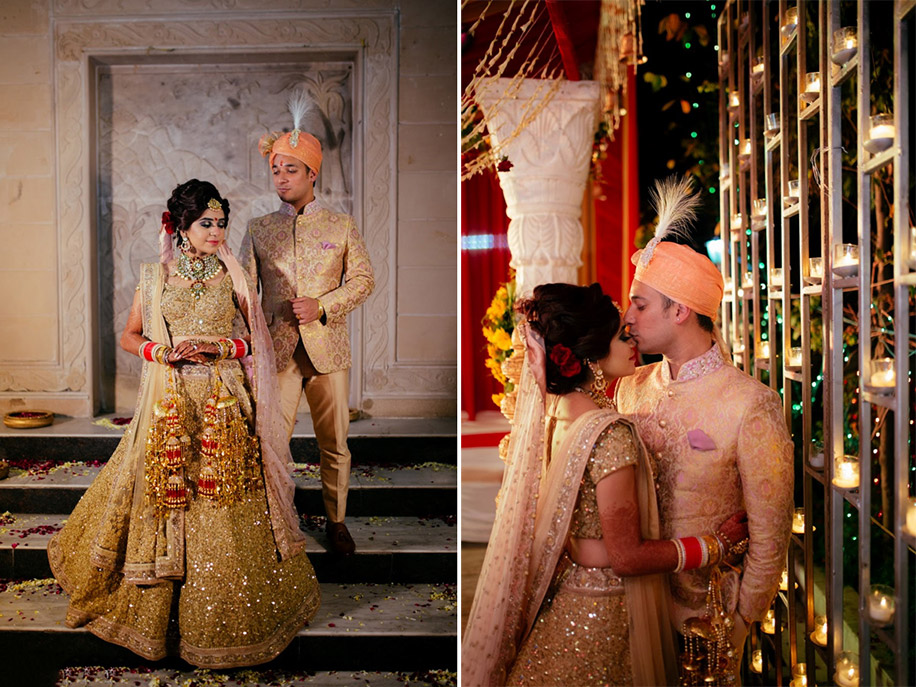 The wedding nuptials were a traditional affair with the bride and groom tying the knot in a traditional temple setting. The bride wore a gorgeous lehenga from Frontier Raas with stunning all-over gold intricate design, dual dupattas and short-sleeved blouse which paired well with her elegant neckpiece, earrings and ‘maang tikka‘ (forehead ornament) by Hazoorilal Jewellers. Shivank looked like a regal prince in his classy outfit by Diwan Sahib.