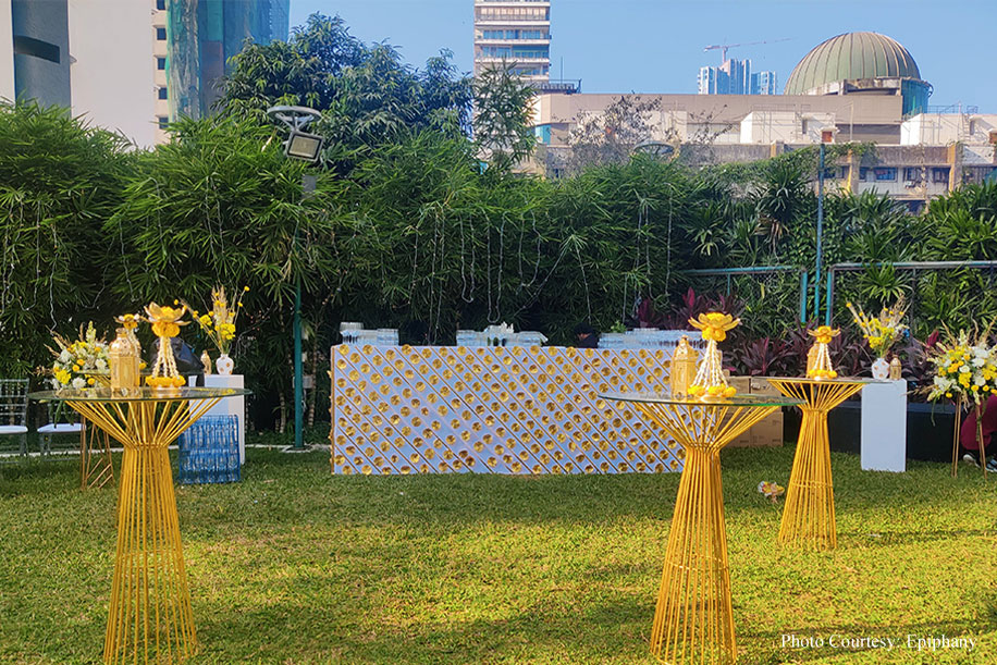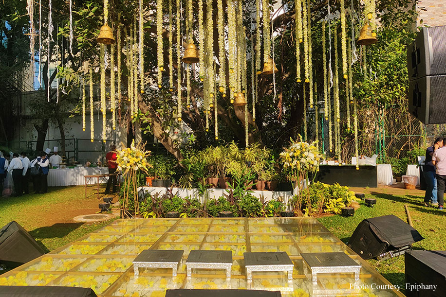 The festivities started with a non-religious havan performed by Akanksha’s grandmother and aunt under the glorious banyan tree in her apartment complex. The decor of yellow marigolds, rajnigandha flowers, ethnic brass bells, gota flowers, earthen pots, and wicker elements set a tender, tranquil note for the occasion. The couple eschewed the varmala and phera ceremony in favor of a legal registration and signing ceremony surrounded by their closest friends and family members. Sufi music and dance performances followed on a shimmering floral dance floor that stole the show. DJ Amey Lakhani kept the party going inside with his riveting beats.